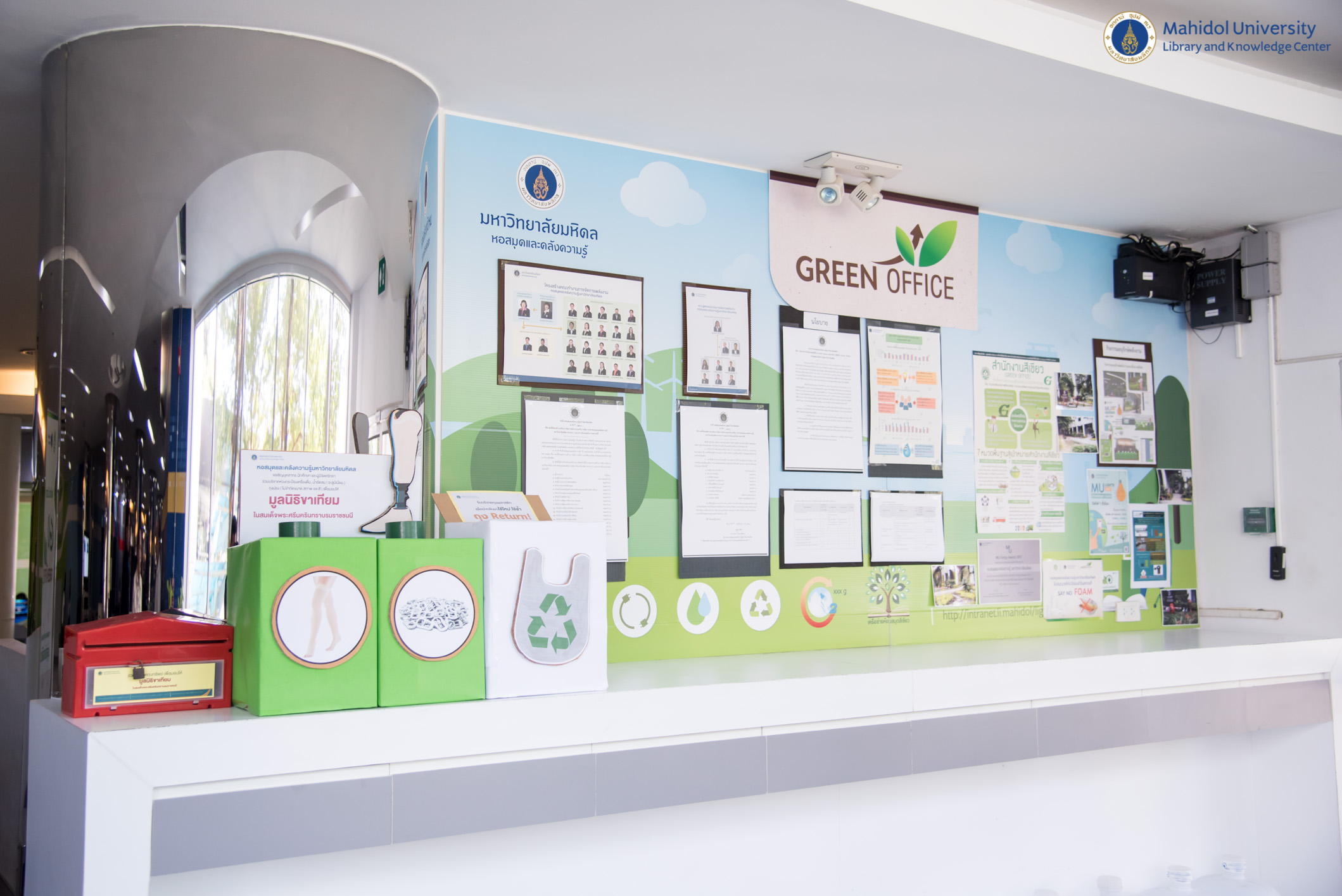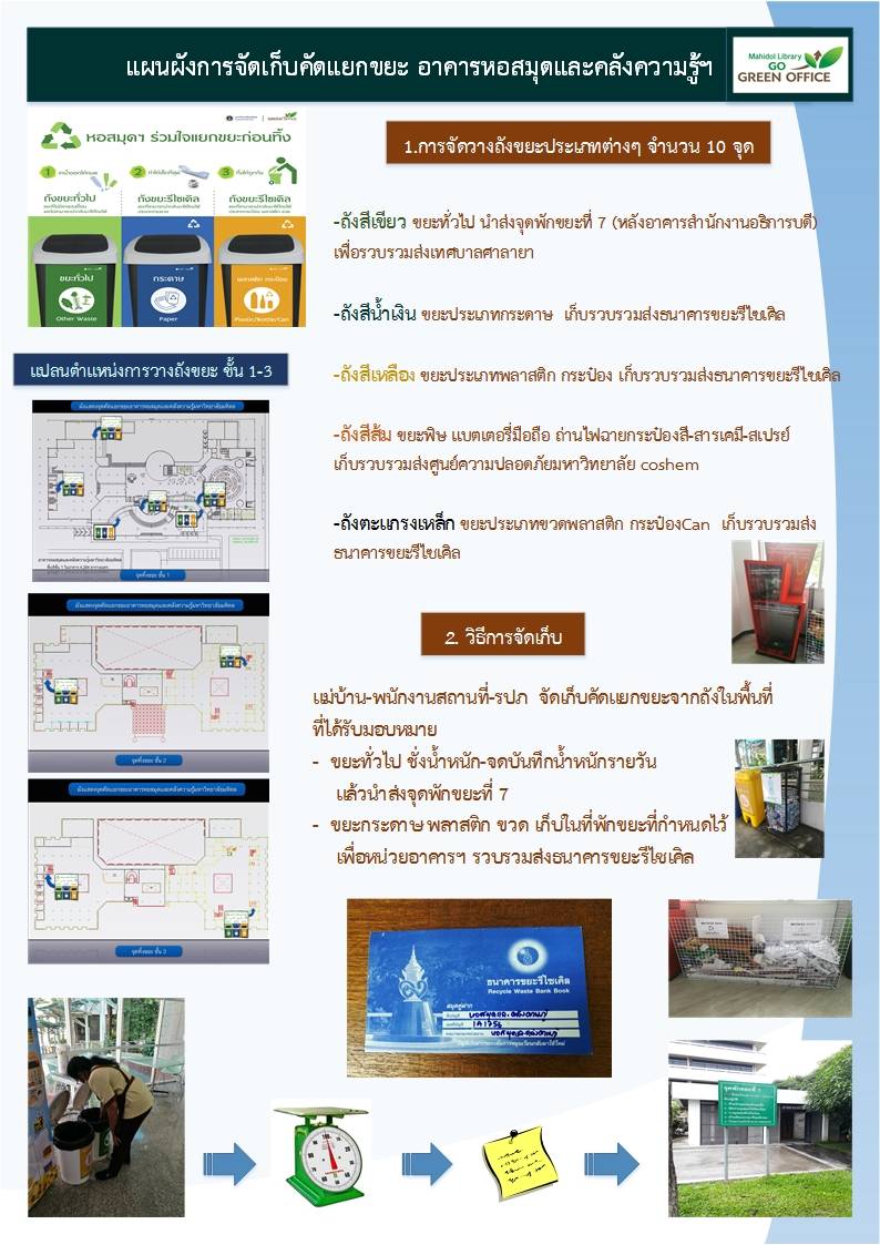 - - จัดกิจกรรม/โครงการส่งเสริมการคัดแยกขยะภายในองค์กร ผ่านโครงการ “เพิ่มประสิทธิภาพหอสมุดและคลังความรู้มหาวิทยาลัยมหิดลด้วย “5ส” แบ่งขยะ ออกเป็น ประเภทต่างๆ ติดป้ายสัญลักษณ์ เพื่ออำนวยความสะดวกในการทิ้งให้ถูกประเภท โดยใช้คำอธิบายสั้นๆ ที่จะช่วยให้บุคลากรและผู้มาใช้บริการสามารถทิ้งขยะได้ถูกถังภายในเวลาไม่เกิน 10-20 วินาที เช่น ทิ้งถ้วยกระดาษ เป็นต้น