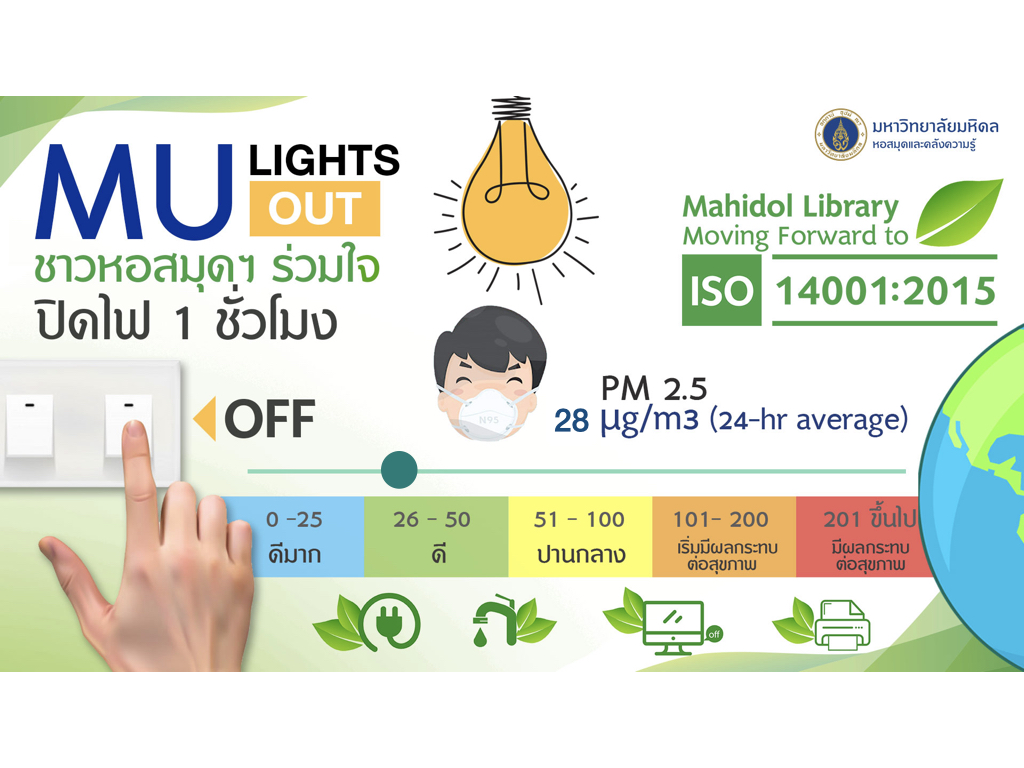 - 1) บุคลากรของหอสมุดฯ ปฏิบัติตามนโยบาย “มหิดล Reduce & Reuse ถุงพลาสติก” ของมหาวิทยาลัย
