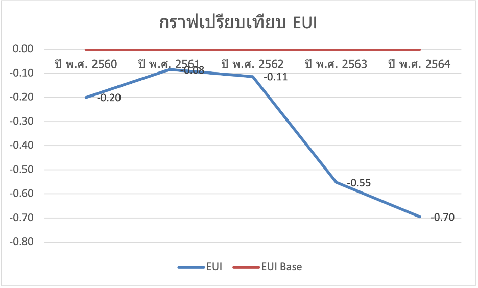 จากกราฟเปรียบตัวชี้วัดประสิทธิภาพการใช้พลังงานไฟฟ้า พบว่า ประสิทภาพการใช้พลังงานไฟฟ้าในอาคารยังไม่ดีพอ ทั้งนี้เนื่องจากมีกิจกรรมการใช้อาคารยังไม่เหมาะสม เช่น ในช่วง ปี 2563 และ ปี 2564 เกิดวิกฤต Covid - 19 ทำให้มีประกาศงดให้บริการในพื้นที่อาคาร แต่ก็ยังมีการใช้งานอาคาร ทำให้ตัวเลข EUI มีค่าเป็น ลบ เพิ่มขึ้น