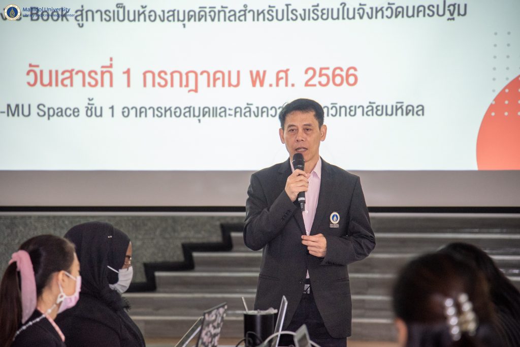 หอสมุดและคลังความรู้มหาวิทยาลัยมหิดล โดย ดร.อภิภู สิทธิภูมิมงคล รองผู้อำนวยการฝ่ายเทคโนโลยีการศึกษาและพันธกิจพิเศษ เป็นประธานในพิธีกล่าวเปิดโครงการฝึกอบรมการพัฒนาระบบห้องสมุดอัตโนมัติ Senayan ให้แก่โรงเรียนในจังหวัดนครปฐม ครั้งที่ 2 เมื่อวันเสาร์ที่ 1 กรกฎาคม พ.ศ. 2566 ที่ผ่านมา ณ บริเวณ Co-MU Space ชั้น 1 อาคารหอสมุดและคลังความรู้มหาวิทยาลัยมหิดล ศาลายา โดยได้รับเกียรติจากวิทยากรผู้ทรงคุณวุฒิ จำนวน 6 ท่าน ดังนี้ คุณพสิษฐ์สัทคุณ จุลละมณฑล ผู้อำนวยการฝ่ายปฏิบัติการ บริษัท สยามจุลละมณฑล จำกัด คุณจุฑาทิพย์ สุกาญจนาเศรษฐ์ กรรมการบริหารและบรรณาธิการ บริษัท สยามจุลละมณฑล จำกัด คุณไพบูลย์ วงษ์ปาน คุณครูโรงเรียนบุณยศรีสวัสดิ์ คุณอภิชยาภา คูพะเนียด หัวหน้างานวิเคราะห์ทรัพยากรสารสนเทศ หอสมุดและคลังความรู้ฯ คุณสุรศักดิ์ บุตรศรี บรรณารักษ์ งานวิเคราะห์ทรัพยากรสารสนเทศ หอสมุดและคลังความรู้ฯ และคุณศกล มงคลเนตร์ เจ้าหน้าที่ระบบงานคอมพิวเตอร์ งานเทคโนโลยีสารสนเทศ