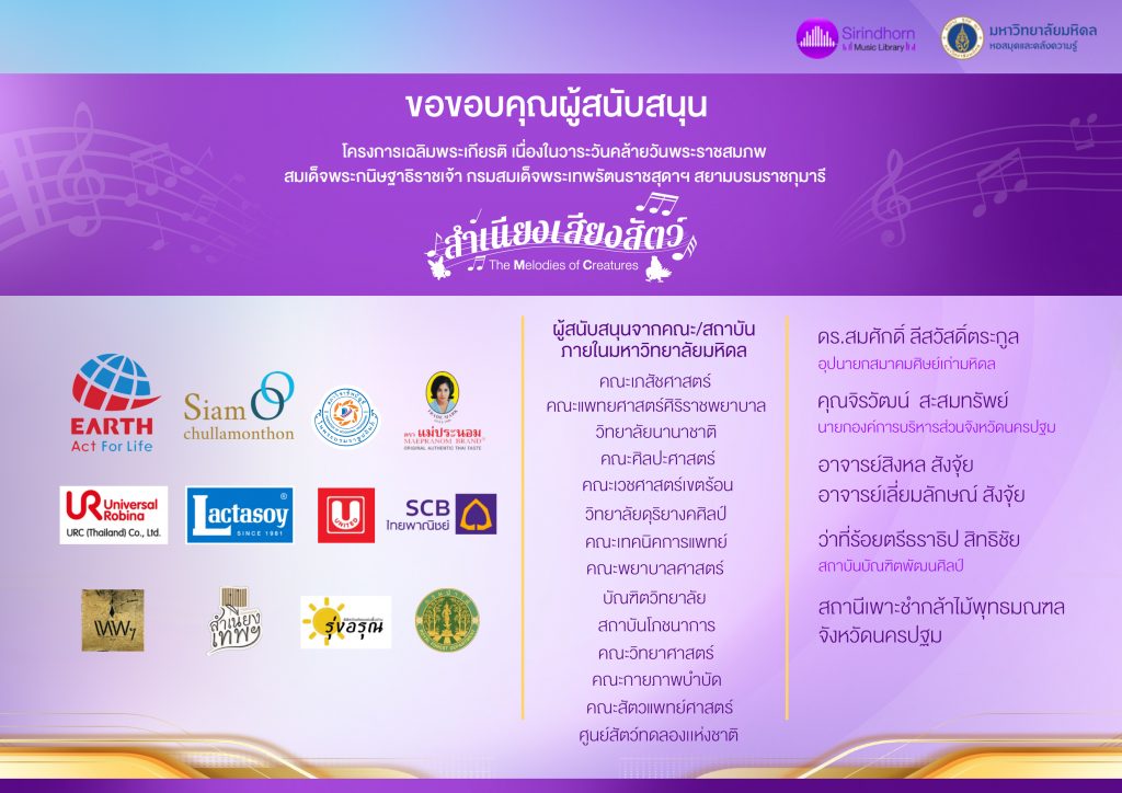 วันคล้ายวันพระราชสมภพสมเด็จพระกนิษฐาธิราชเจ้า กรมสมเด็จพระเทพรัตนราชสุดาฯ สยามบรมราชกุมารี ภายใต้ชื่องาน “สำเนียงเสียงสัตว์” ดำเนินการโดย ห้องสมุดดนตรีสมเด็จพระเทพรัตน์