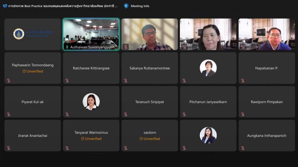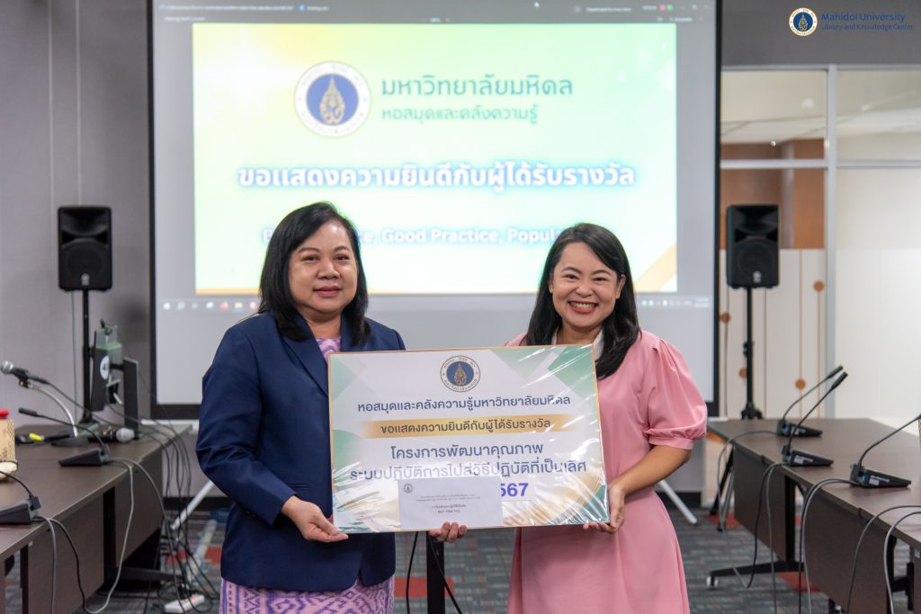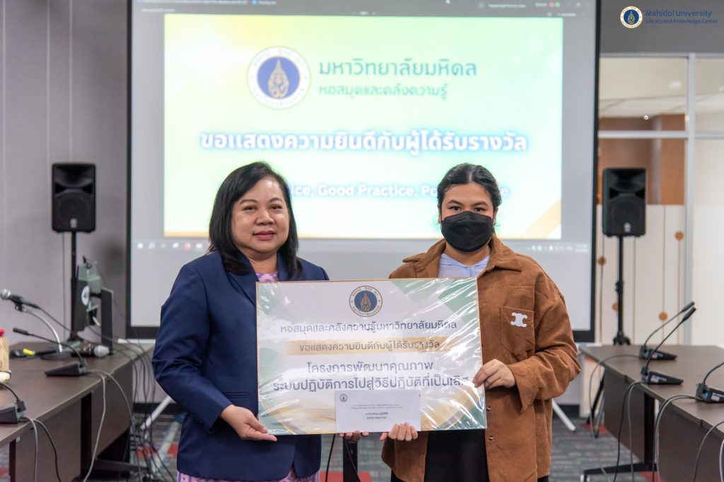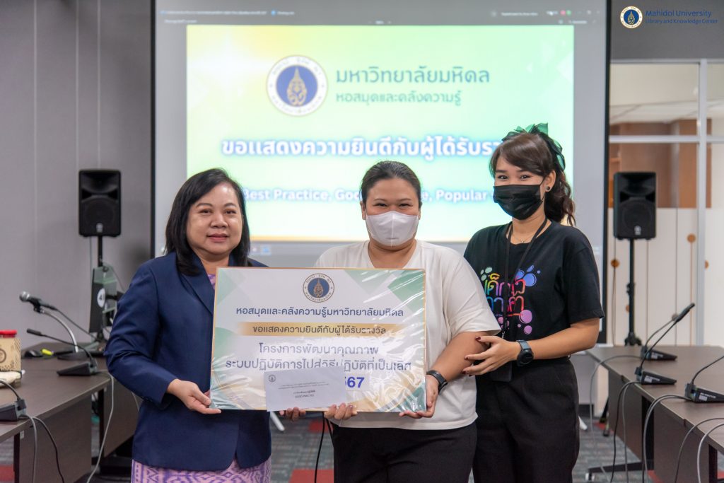 หอสมุดและคลังความรู้มหาวิทยาลัยมหิดล โดย คุณอังคณา อินทรพาณิชย์ รองผู้อำนวยการฝ่ายบริหารและพัฒนาคุณภาพ เป็นประธานในพิธีกล่าวเปิดโครงการพัฒนาคุณภาพระบบปฏิบัติการไปสู่วิธีปฏิบัติที่เป็นเลิศ (Best Practice) ของหอสมุดและคลังความรู้มหาวิทยาลัยมหิดล ประจำปีงบประมาณ 2567 และให้เกียรติเป็นคณะกรรมการตัดสินผลงาน ร่วมกับคณะผู้บริหารหอสมุดและคลังความรู้ฯ จำนวน 3 ท่าน ได้แก่ คุณอุษณีย์ เพ็งเที่ยง รองผู้อำนวยการฝ่ายทรัพยากรและคลังความรู้ อาจารย์ ดร.เอกชัย วารินศิริรักษ์ รองผู้อำนวยการฝ่ายนวัตกรรมบริการห้องสมุด และผู้ช่วยศาสตราจารย์ ดร.ทวีศักดิ์ สมานชื่น รองผู้อำนวยการฝ่ายเทคโนโลยีดิจิทัล พร้อมด้วยกรรมการผู้ทรงคุณวุฒิจากภายนอก 2 ท่าน ได้แก่ ผู้ช่วยศาสตราจารย์ ดร.กันยารัตน์ เควียเซ่น หัวหน้าสาขาวิชาสารสนเทศศาสตร์ คณะมนุษยศาสตร์และสังคมศาสตร์ มหาวิทยาลัยขอนแก่น และรองศาสตราจารย์ ดร.สมศักดิ์ ศรีบริสุทธิ์สกุล ประธานหลักสูตรบัณฑิตศึกษาระดับปริญญาโทและปริญญาเอก สาขาวิชาสารสนเทศศึกษา คณะอักษรศาสตร์ จุฬาลงกรณ์มหาวิทยาลัย เมื่อวันพฤหัสบดีที่ 2 สิงหาคม พ.ศ. 2567 ณ ห้องประชุม 2 ชั้น 3 อาคารหอสมุดและคลังความรู้ฯ ศาลายา และผ่านระบบประชุมออนไลน์ Cisco WebEx Meetings ซึ่งมีบุคลากรหอสมุดและคลังความรู้ฯ จากฝ่ายงานต่าง ๆ ส่งผลงานเข้าร่วมประกวดทั้งสิ้นจำนวน 6 ผลงาน
