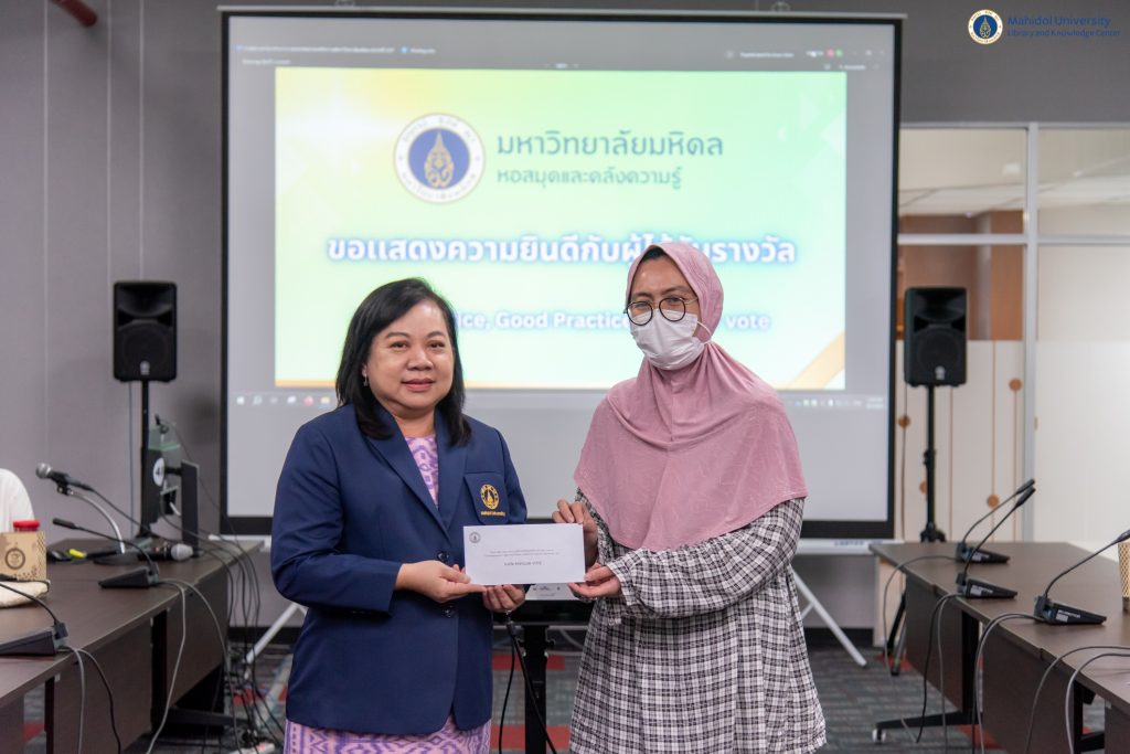 โดย คุณดาริกา เชื้อสมัน บรรณารักษ์ งานพัฒนาทรัพยากรสารสนเทศ และได้รับรางวัล “Popular Vote” ผลงานที่ผู้เข้าฟังชื่นชอบมากที่สุด
