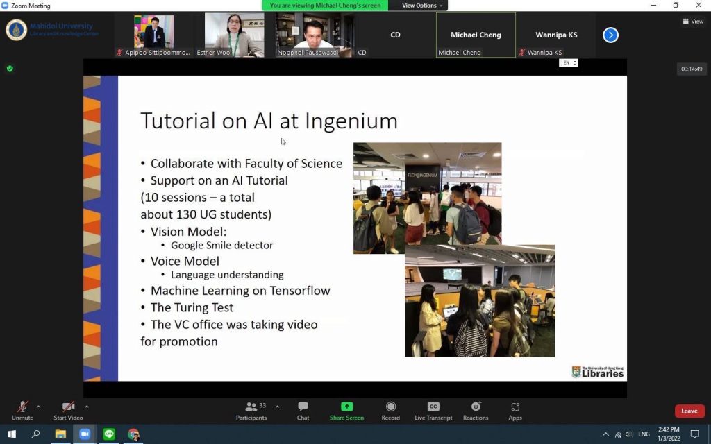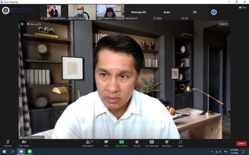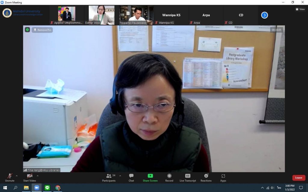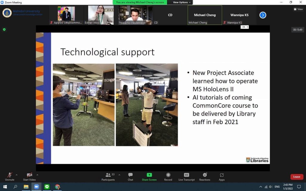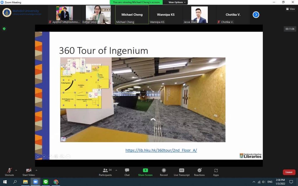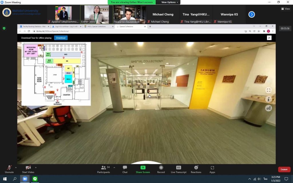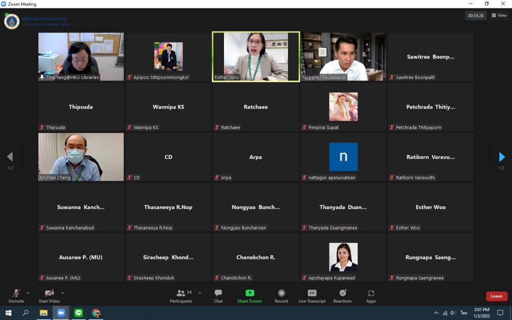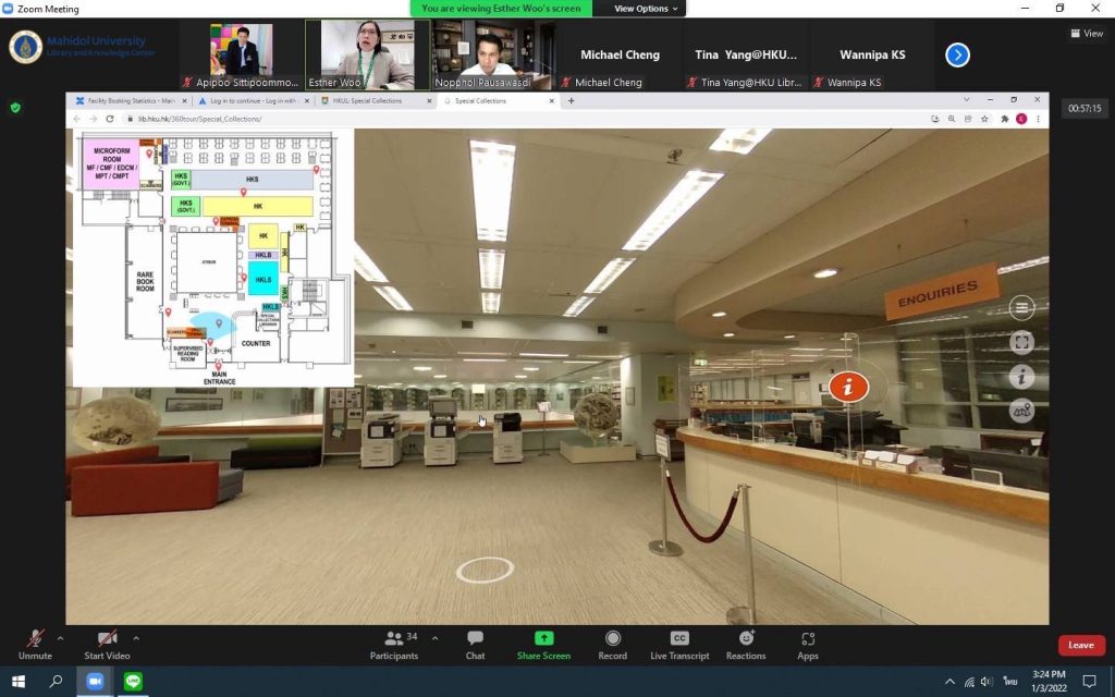 หอสมุดและคลังความรู้มหาวิทยาลัยมหิดล โดยผู้ช่วยศาสตราจารย์ ดร.นพพล เผ่าสวัสดิ์ ผู้อำนวยการหอสมุดและคลังความรู้มหาวิทยาลัยมหิดล และทีมผู้บริหาร ประกอบด้วย คุณอังคณา อินทรพาณิชย์ รองผู้อำนวยการฝ่ายบริหารและพัฒนาคุณภาพห้องสมุด ดร.อภิภู สิทธิภูมิมงคล รองผู้อำนวยการฝ่ายเทคโนโลยีการศึกษาและพันธกิจพิเศษ ผู้ช่วยศาสตราจารย์ ดร.ทัศนียา รัตนฤๅทัย นพรัตน์แจ่มจำรัส รองผู้อำนวยการฝ่ายวิจัยและวิชาการ พร้อมด้วยหัวหน้าห้องสมุดฯ หัวหน้าฝ่ายฯและหัวหน้างานฯ เข้าร่วมศึกษาดูงานห้องสมุด มหาวิทยาลัยฮ่องกง ผ่านระบบ Zoom Meeting Online เมื่อวันที่ 3 มกราคม 2565 โดยมี Dr. Esther Woo ผู้อำนวยการฝ่ายบริการห้องสมุด Mr.Michael Cheng รองบรรณารักษ์ การมีส่วนร่วม และสภาพแวดล้อมการเรียนรู้ Ms.Tina Yang รองบรรณารักษ์ บริการการเรียนรู้และวิจัย และMr.Jesse Xiao บรรณารักษ์การสื่อสารทางข้อมูลและวิชาการ พร้อมด้วยทีมงาน ให้การต้อนรับและนำเยี่ยมชม ห้องสมุดของมหาวิทยาลัยฮ่องกง ซึ่งมีประเด็นในการศึกษาดูงานดังนี้