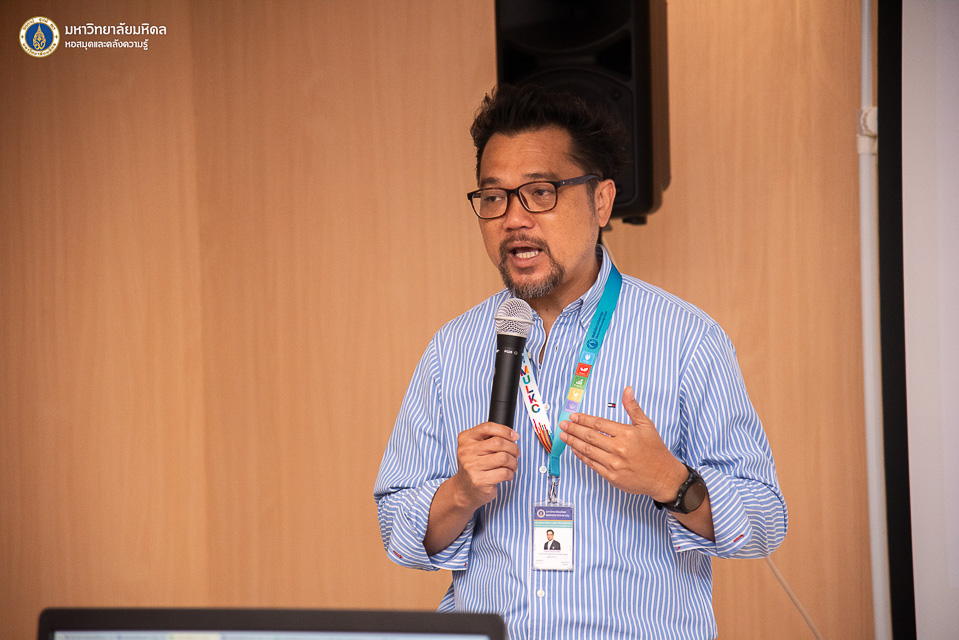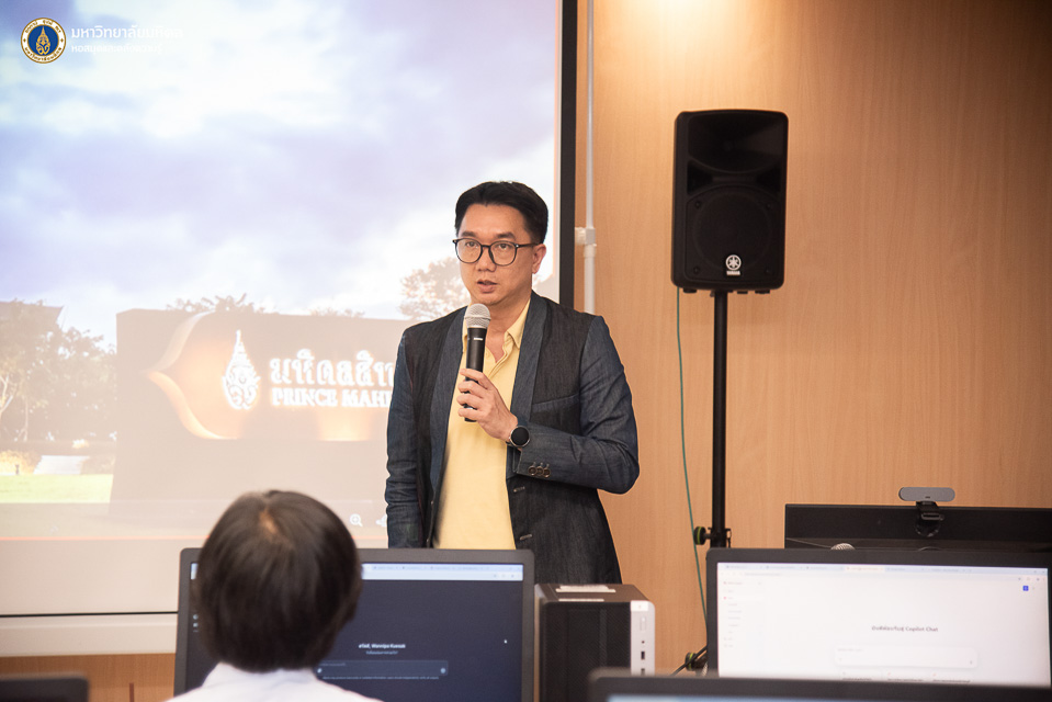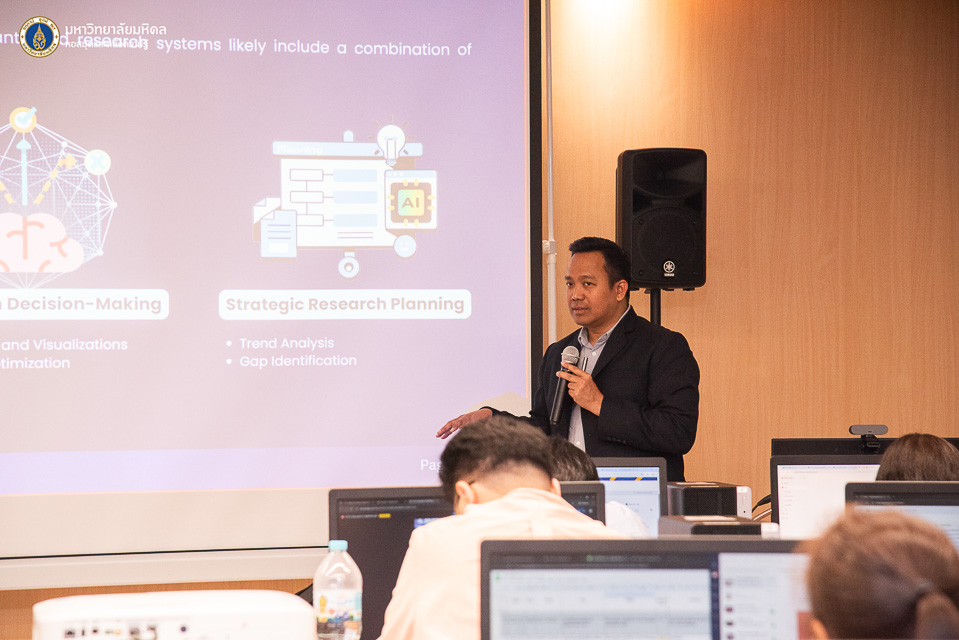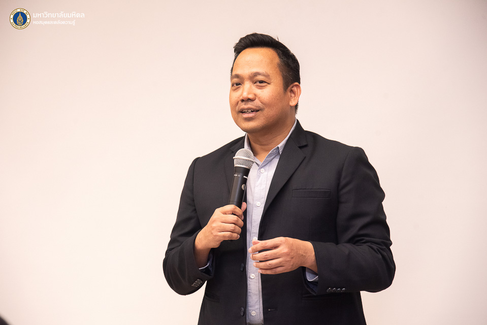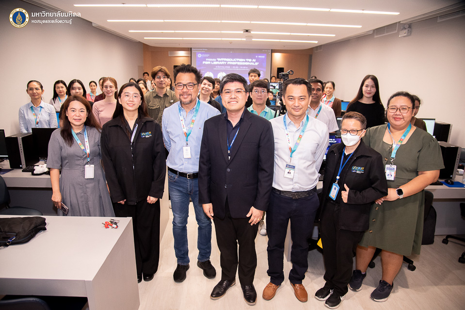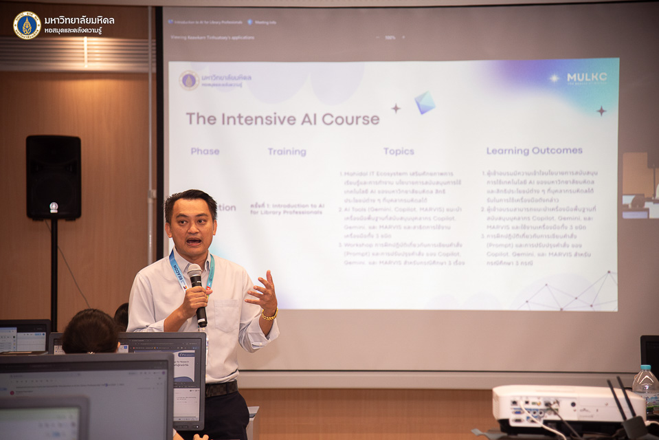 หอสมุดและคลังความรู้มหาวิทยาลัยมหิดล โดย ผู้ช่วยศาสตราจารย์ ดร.สราวุธ เวชกิจ ผู้อำนวยการหอสมุดและคลังความรู้ฯ เป็นประธานกล่าวเปิดการอบรม Introduction to AI for Library Professionals ภายใต้โครงการอบรมเชิงปฏิบัติการ AI Skill raise-up for Research assistant: ยกระดับทักษะปัญญาประดิษฐ์สำหรับผู้ช่วยการวิจัย” ในโอกาสนี้ได้รับเกียรติจากผู้ช่วยศาสตราจารย์ ดร.นริศ หนูหอม ผู้ช่วยอธิการบดีฝ่ายสารสนเทศและดิจิทัลทรานส์ฟอร์เมชัน และรักษาแทนผู้อำนวยการกองเทคโนโลยีสารสนเทศ มหาวิทยาลัยมหิดล เป็นวิทยากรบรรยายในหัวข้อ “Mahidol IT Ecosystem สนับสนุนการเรียนรู้และทำงานด้วย AI พร้อมสิทธิประโยชน์สำหรับบุคลากร” พร้อมด้วยว่าที่ ร้อยตรี ธีรพัฒน์ กันสดับ คุณปัณณภัสร์ กีรติบารมีรัตน์ และคุณประภาสิริ เศวตสุทธิพันธ์ งานพัฒนาและบริหารระบบเทคโนโลยีสารสนเทศ กองเทคโนโลยีสารสนเทศ มหาวิทยาลัยมหิดล ในหัวข้อ “AI in Practice – Ai Tool เพื่อพัฒนาศักยภาพ” และคุณปัญจพัฒน์ เกรียงวีระยุทธ จากบริษัท โก ดิจิท จำกัด ในวันอังคารที่ 5 สิงหาคม พ.ศ. 2568 ณ ห้องอบรมคอมพิวเตอร์ ชั้น 2 อาคารหอสมุดและคลังความรู้ฯ ศาลายา และในรูปแบบออนไลน์ผ่านระบบ Cisco WebEx Meeting โดยมีคณะผู้บริหาร บุคลากรหอสมุดและคลังความรู้ฯ และบุคลากรห้องสมุดเครือข่ายมหาวิทยาลัยมหิดล เข้ารับการอบรมทั้งสิ้น จำนวน 46 ท่าน เพื่อส่งเสริมให้บุคลากรรู้จักและเข้าถึงบริการเทคโนโลยีสารสนเทศ และทักษะการใช้เครื่องมือ Generative AI เพื่อตอบสนองความต้องการของผู้ใช้อย่างมีประสิทธิภาพ