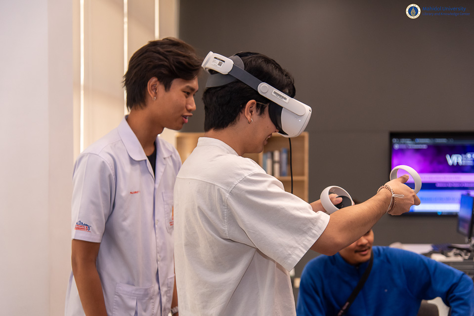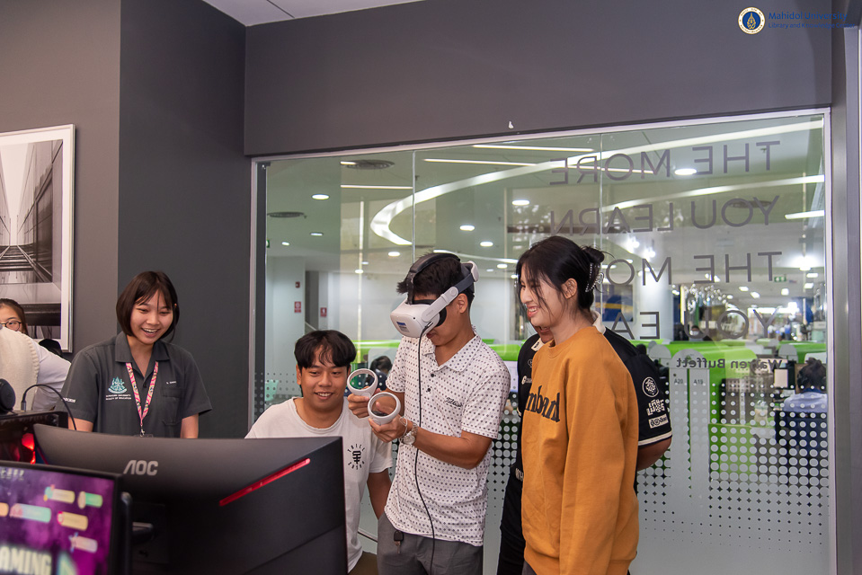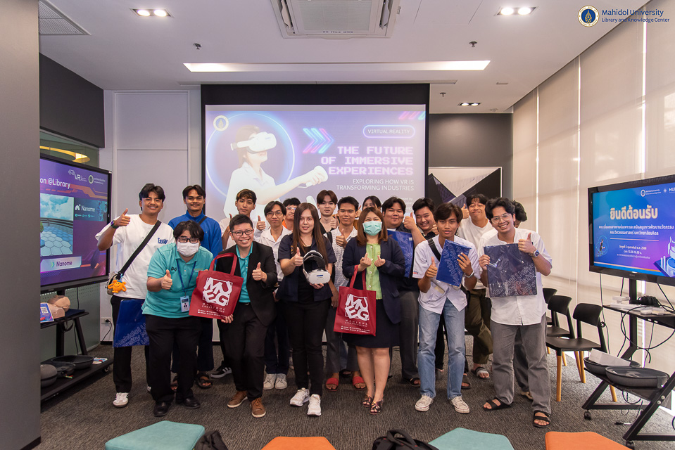 หอสมุดและคลังความรู้มหาวิทยาลัยมหิดล โดย คุณนภัสวรรณ สุพัตร หัวหน้างานเทคโนโลยีสารสนเทศ ให้การต้อนรับคณะผู้ศึกษาดูงานจากงานบ่มเพาะและสนับสนุนการพัฒนานวัตกรรม คณะวิศวกรรมศาสตร์ มหาวิทยาลัยมหิดล จำนวน 30 ท่าน นำโดย ผู้ช่วยศาสตราจารย์ ดร.พรทิพย์ แก่งอินทร์ รองคณบดีฝ่ายพัฒนาเครือข่ายและองค์กรสัมพันธ์ คณะวิศวกรรมศาสตร์ มหาวิทยาลัยมหิดล ในโอกาสเข้าเยี่ยมชมและศึกษาดูงานเทคโนโลยี VR ภายใต้กิจกรรม “VR for Innovation & Education” ในวันพุธที่ 5 กุมภาพันธ์ พ.ศ. 2568 ณ VR Space ชั้น 1 อาคารหอสมุดและคลังความรู้ฯ ศาลายา โดยมีวัตถุประสงค์เพื่อให้นักศึกษาและบุคลากรผู้เข้าร่วมกิจกรรมมีความรู้ความเข้าใจเกี่ยวกับเทคโนโลยี VR และเสริมสร้างประสบการณ์ด้านเทคโนโลยี VR ที่กำลังมีบทบาทสำคัญโดยเฉพาะด้านการศึกษาผ่านกิจกรรมเชิงปฏิบัติการด้วยเกม Car Mechanic Simulator เกมการจำลองสถานการณ์การซ่อมระบบเครื่องยนต์ เพื่อเสริมสร้างทักษะเรียนรู้การใช้อุปกรณ์เครื่องมือต่าง ๆ และความคิดสร้างสรรค์