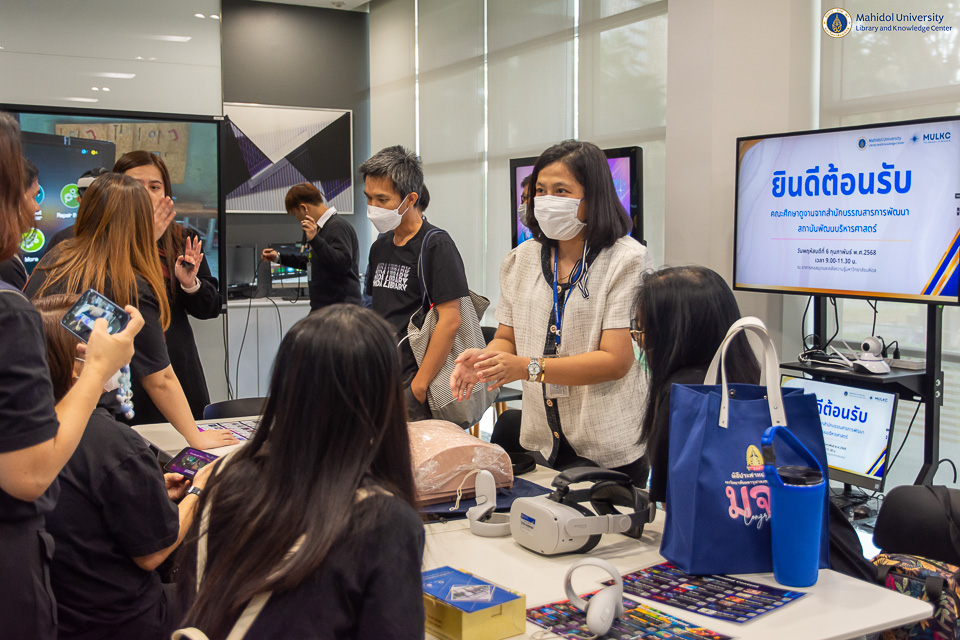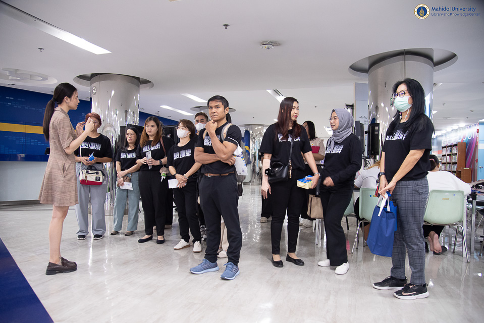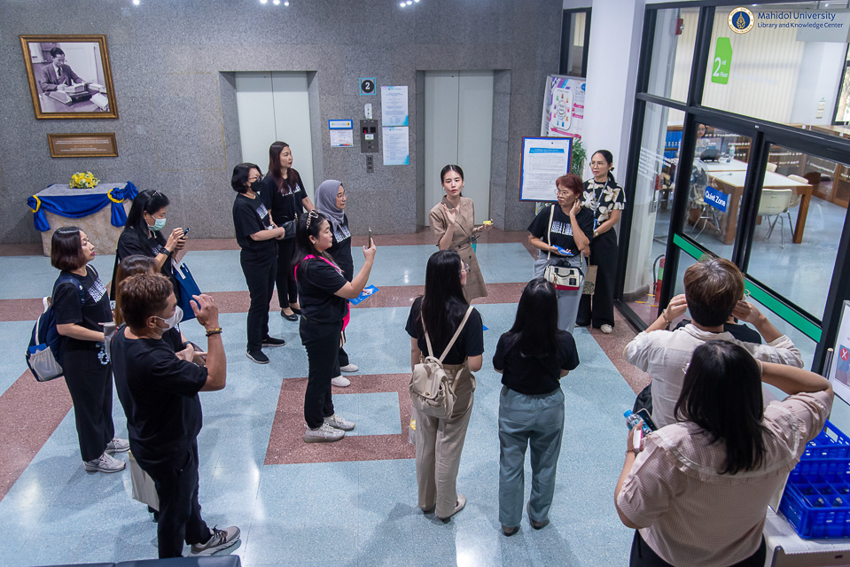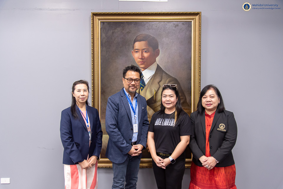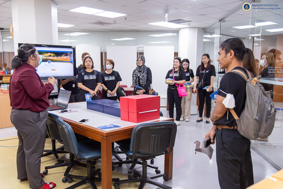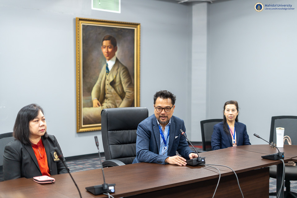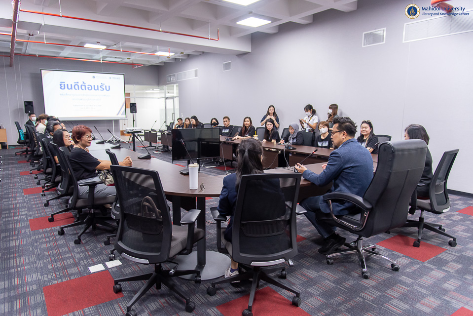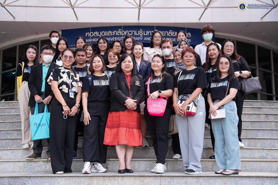 หอสมุดและคลังความรู้มหาวิทยาลัยมหิดล โดย ผู้ช่วยศาสตราจารย์ ดร.สราวุธ เวชกิจ ผู้อำนวยการหอสมุดและคลังความรู้ฯ พร้อมด้วยคณะผู้บริหารและบุคลากร ให้การต้อนรับผู้ศึกษาดูงานจากสำนักบรรณสารการพัฒนา สถาบันบัณฑิตพัฒนบริหารศาสตร์ นำโดย คุณกรัณฑ์รัตน์ ประเสริฐธนากุล รักษาการแทนผู้อำนวยการกองบริหารทรัพยากรสารสนเทศและการเรียนรู้ พร้อมด้วยบุคลากรจำนวน 16 ท่าน ในวันพฤหัสบดีที่ 6 กุมภาพันธ์ พ.ศ. 2568 ณ อาคารหอสมุดและคลังความรู้ฯ ศาลายา โดยมีวัตถุประสงค์เพื่อเข้าศึกษาดูงานและแลกเปลี่ยนเรียนรู้กระบวนการบริหารและบริการทรัพยากรสารสนเทศของหอสมุดและคลังความรู้ฯ ตลอดจนสร้างเครือข่ายความร่วมมือระหว่างห้องสมุดให้แข็งแรงยิ่งขึ้น