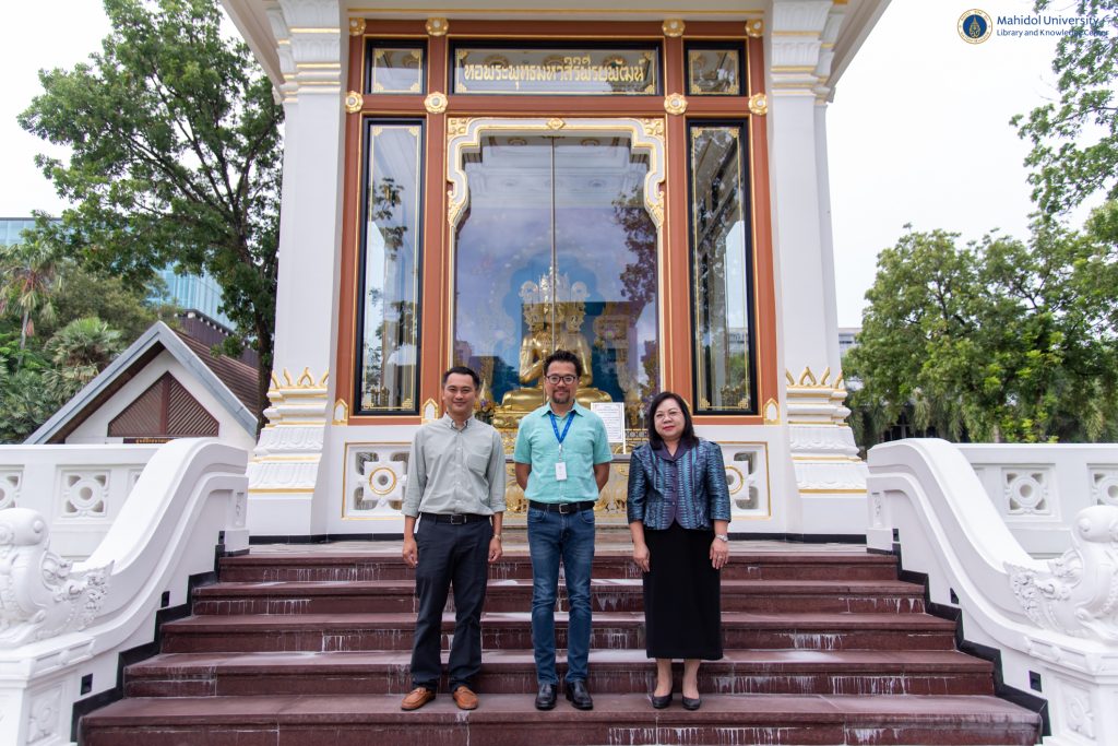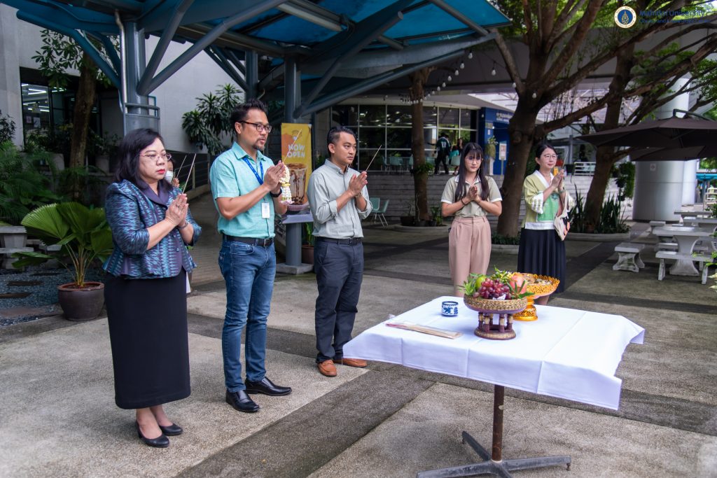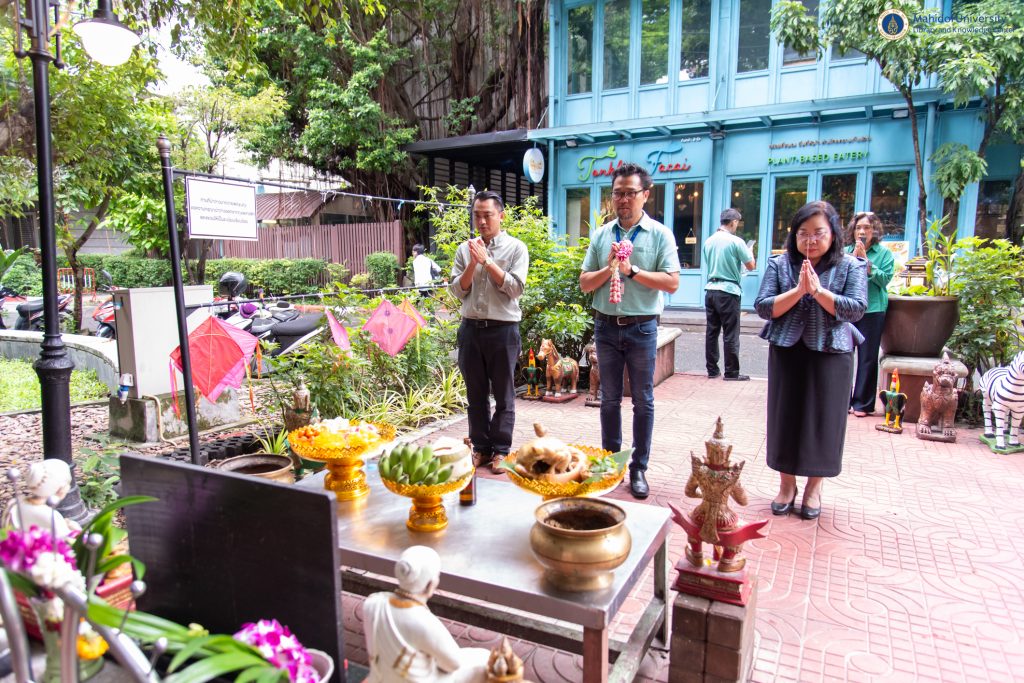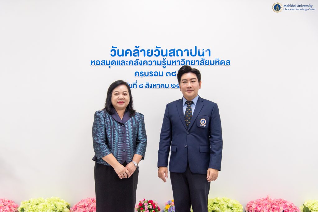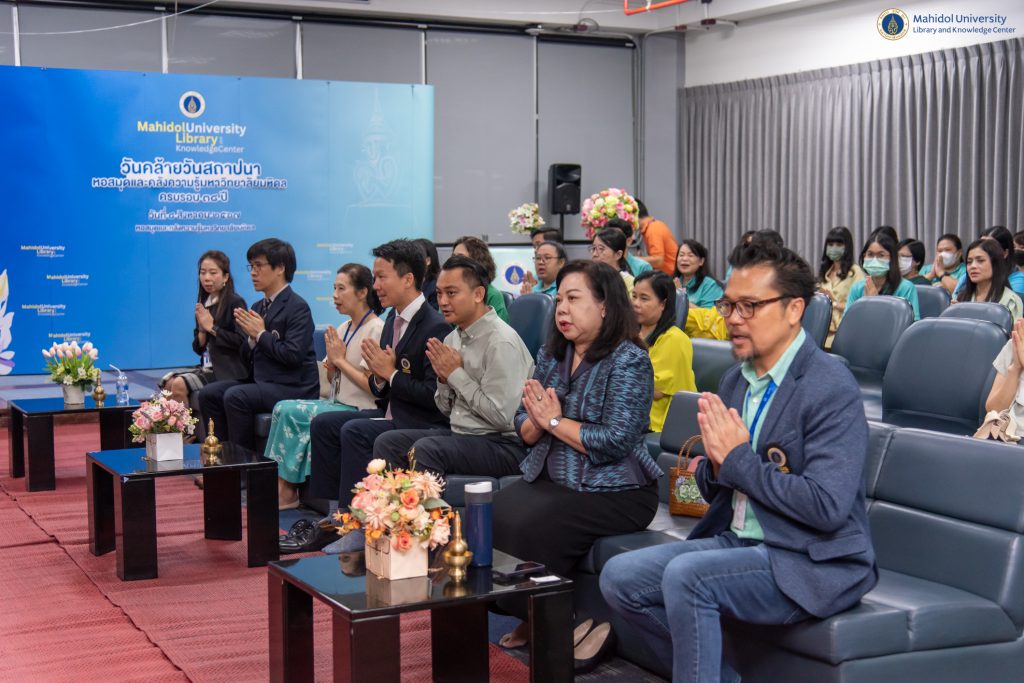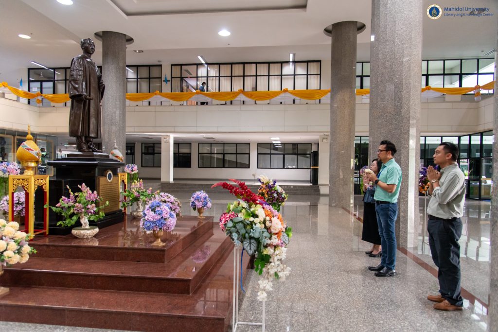 หอสมุดและคลังความรู้มหาวิทยาลัยมหิดล โดย ผู้ช่วยศาสตราจารย์ ดร.สราวุธ เวชกิจ ผู้อำนวยการหอสมุดและคลังความรู้ฯ พร้อมด้วยคณะผู้บริหารฯ เข้าสักการะสิ่งศักดิ์สิทธิ์โดยรอบมหาวิทยาลัยมหิดล ศาลายา ได้แก่ พระพุทธมหิดลมงคลปัญญาญาณ ศาลเจ้าพ่อขุนทุ่ง สิ่งศักดิ์สิทธิ์ประจำหอสมุดและคลังความรู้ฯ และเข้าสักการะพระราชานุสาวรีย์สมเด็จพระมหิตลาธิเบศร อดุลยเดชวิกรม พระบรมราชชนก ณ สำนักงานอธิการบดีมหาวิทยาลัยมหิดล เพื่อเสริมความเป็นสิริมงคล เนื่องในโอกาสวันคล้ายวันสถาปนาหอสมุดและคลังความรู้มหาวิทยาลัยมหิดล ปีที่ 38 ในวันพฤหัสบดีที่ 8 สิงหาคม พ.ศ. 2567 โดยมีผู้ช่วยศาสตราจารย์ ดร.อิทธิโชติ จักรไพวงศ์ รักษาการแทนรองอธิการบดีฝ่ายกายภาพและสิ่งแวดล้อม คณบดี หัวหน้าส่วนงาน และผู้แทนจากส่วนงานต่าง ๆ ของมหาวิทยาลัยมหิดล เข้าร่วมแสดงความยินดีในโอกาสนี้