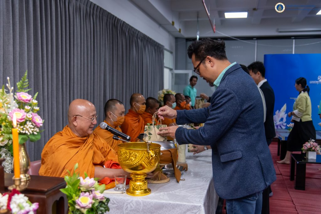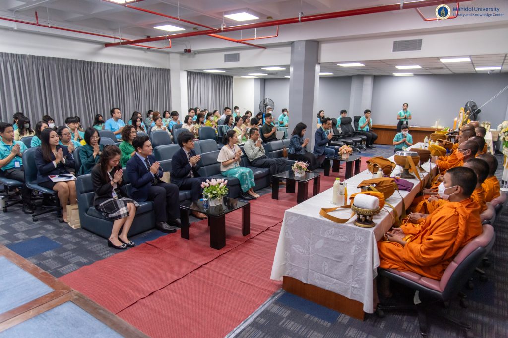 จากนั้น ผู้ช่วยศาสตราจารย์ ดร.สราวุธ เวชกิจ เป็นประธานในพิธีทำบุญตักบาตรแด่พระสงฆ์ จำนวน 9 รูป ณ ห้องประชุม 1 ชั้น 3 อาคารหอสมุดและคลังความรู้ฯ ศาลายา และเป็นประธานในพิธีมอบเกียรติบัตร จำนวน 3 รายการ ดังนี้