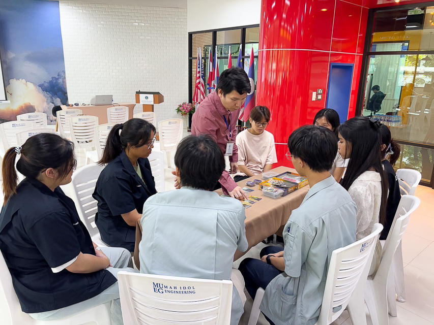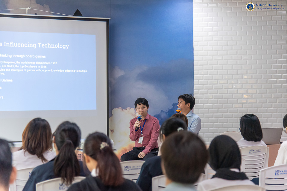 หอสมุดและคลังความรู้มหาวิทยาลัยมหิดล โดย คุณศรัณย์ ธรรมทักษิณ นักเอกสารสนเทศ งานเทคโนโลยีสารสนเทศ ได้รับเกียรติเป็นวิทยากรร่วมกับ คุณพิทวัส ทิวทิพย์สกุล วิศวกร งานบ่มเพาะและสนับสนุนการพัฒนานวัตกรรม คณะวิศวกรรมศาสตร์ มหาวิทยาลัยมหิดล ในกิจกรรมเสวนาหัวข้อ “เทคโนโลยีกับบอร์ดเกมส์” และกิจกรรม Workshop แนะนำการเล่นบอร์ดเกมส์ ซึ่งเป็นการจัดกิจกรรมร่วมกันระหว่าง คณะวิศวกรรมศาสตร์ มหาวิทยาลัยมหิดล กับหอสมุดและคลังความรู้มหาวิทยาลัยมหิดล ในโอกาสนี้ ได้รับเกียรติจาก ผู้ช่วยศาสตราจารย์ ดร.พรทิพย์ แก่งอินทร์ รองคณบดีฝ่ายพัฒนาเครือข่ายและองค์กรสัมพันธ์ ร่วมให้การต้อนรับ ในวันพุธที่ 8 มกราคม พ.ศ. 2568 ณ Innogineer Studio ชั้น 1 อาคาร 3 คณะวิศวกรรมศาสตร์ มหาวิทยาลัยมหิดล โดยมีวัตถุประสงค์เพื่อส่งเสริมความรู้และความเข้าใจเกี่ยวกับการบูรณาการเทคโนโลยีกับการออกแบบและการเล่นบอร์ดเกม อีกทั้งมุ่งเน้นการพัฒนาทักษะด้านวิศวกรรม เช่น การแก้ปัญหา การวางกลยุทธ์ และการทำงานร่วมกันเป็นทีม ให้กับนักศึกษาคณะวิศวกรรมศาสตร์ จำนวน 25 คน