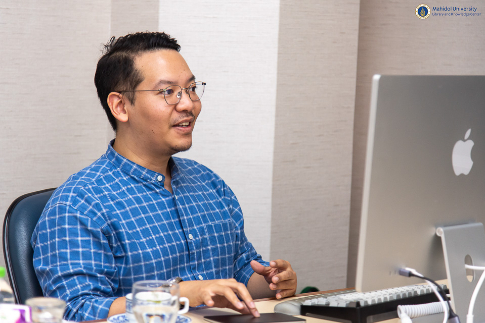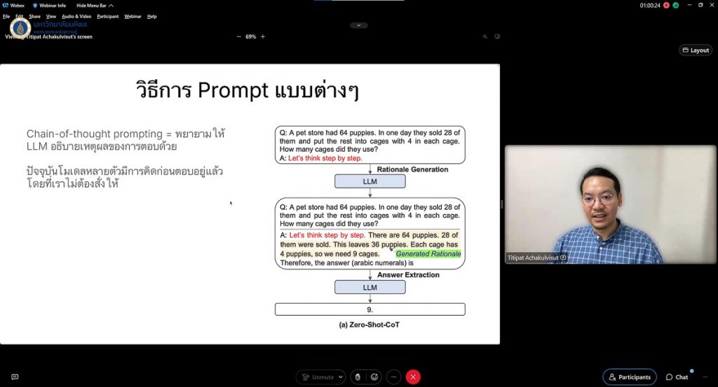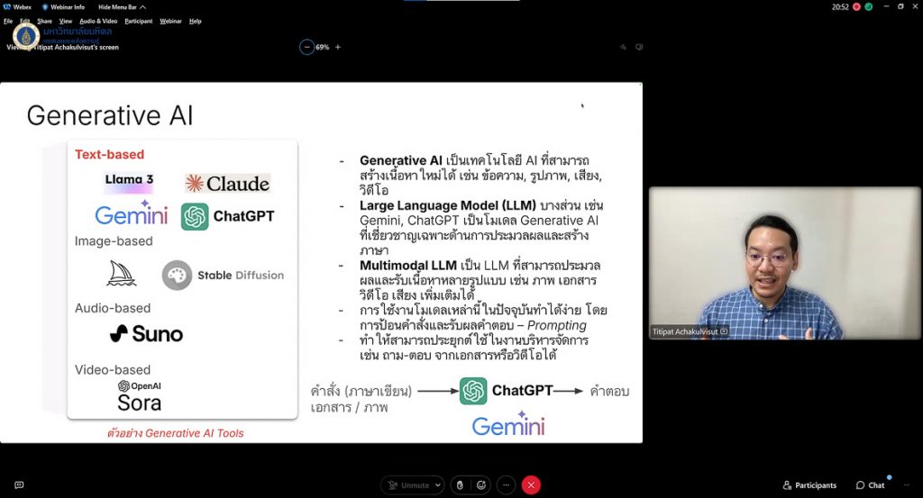 หอสมุดและคลังความรู้มหาวิทยาลัยมหิดล ดำเนินการจัดอบรมโครงการ “The Future is Now” โดยได้รับเกียรติจาก อ.ดร. ฐิติพัทธ อัชชะกุลวิสุท ภาควิชาวิศวกรรมชีวการแพทย์ คณะวิศวกรรมศาสตร์ มหาวิทยาลัยมหิดล เป็นวิทยากรบรรยายในหัวข้อ “การประยุกต์ใช้ Generative AI สำหรับนักเรียนและการสอน” ในวันพุธที่ 9 เมษายน พ.ศ. 2568 ณ ห้องประชุม 3 ชั้น 3 อาคารหอสมุดและคลังความรู้ฯ ศาลายา และผ่านระบบออนไลน์ Cisco WebEx Meeting ซึ่งมีนักศึกษา อาจารย์ และบุคลากรมหาวิทยาลัยมหิดล รวมถึงผู้ที่สนใจทั่วไปเข้ารับการอบรมในครั้งนี้ทั้งสิ้น 290 ท่าน โดยการจัดอบรมในครั้งนี้มีวัตถุประสงค์เพื่อเป็นศูนย์กลางในการแลกเปลี่ยนเรียนรู้เทคโนโลยีสมัยใหม่ทั้งภายในและภายนอกองค์กร เพื่อให้ผู้ที่เข้ารับการอบรมสามารถนำองค์ความรู้และทักษะต่าง ๆ ไปประยุกต์ใช้ในการดำเนินงาน และเข้าใจการใช้ปัญญาประดิษฐ์อย่างมีประสิทธิภาพ