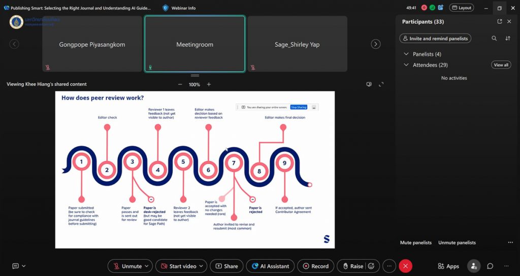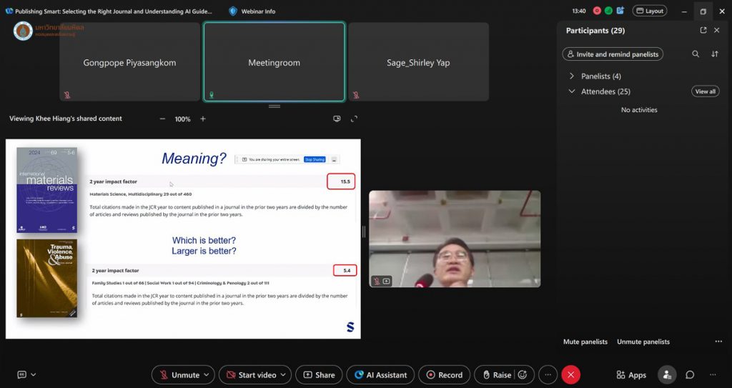 หอสมุดและคลังความรู้มหาวิทยาลัยมหิดล จัดอบรม “การเลือกวารสารที่เหมาะสมและแนวทางการใช้ AI ในการทำงานวิจัย” ในวันจันทร์ที่ 9 กุมภาพันธ์ พ.ศ. 2569 ณ ห้องอบรมคอมพิวเตอร์ชั้น 2 อาคารหอสมุดและคลังความรู้ฯ (ศาลายา) และในรูปแบบออนไลน์ผ่าน Cisco Webex Meeting โดยการอบรมในครั้งนี้ ได้รับเกียรติจาก Dr. Lim Khee Hiang ผู้แทนจากสำนักพิมพ์ SAGE เป็นวิทยากรให้ความรู้แก่ อาจารย์ นักศึกษา และบุคลากรมหาวิทยาลัยมหิดล จำนวน 30 ท่าน โดยมุ่งเน้นการให้ความรู้เกี่ยวกับแนวทางการจัดทำงานวิจัยโดยประยุกต์ใช้เครื่องมือปัญญาประดิษฐ์ (Artificial Intelligence) อย่างเหมาะสม รวมถึงหลักเกณฑ์และแนวทางในการคัดเลือกวารสารที่มีคุณภาพสำหรับการตีพิมพ์ผลงานวิจัย เพื่อยกระดับคุณภาพงานวิจัยและเพิ่มโอกาสในการเผยแพร่ผลงานในระดับสากล สนับสนุนการพัฒนาศักยภาพด้านการวิจัยของบุคลากรและนักศึกษา ตลอดจนส่งเสริมการใช้เทคโนโลยีสมัยใหม่อย่างมีจริยธรรมและเกิดประโยชน์สูงสุดต่อการสร้างองค์ความรู้