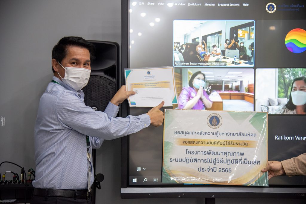 หอสมุดและคลังความรู้มหาวิทยาลัยมหิดล โดย ผู้ช่วยศาสตราจารย์ ดร.นพพล เผ่าสวัสดิ์ ผู้อำนวยการหอสมุดและคลังความรู้มหาวิทยาลัยมหิดล เป็นประธานในพิธีกล่าวเปิดโครงการพัฒนาคุณภาพระบบปฏิบัติการไปสู่วิธีปฏิบัติที่เป็นเลิศ (Best Practice) ของหอสมุดและคลังความรู้มหาวิทยาลัยมหิดล ประจำปีงบประมาณ 2565 โดยมีคุณอังคณา อินทรพาณิชย์ รองผู้อำนวยการฝ่ายบริหารและพัฒนาคุณภาพห้องสมุด ดร.อภิภู สิทธิภูมิมงคล รองผู้อำนวยการฝ่ายเทคโนโลยีการศึกษาและพันธกิจพิเศษ รองศาสตราจารย์ ดร.ทัศนียา รัตนฤๅทัย นพรัตน์แจ่มจำรัส รองผู้อำนวยการฝ่ายวิจัยและวิชาการ และผู้ช่วยศาสตราจารย์ ดร.ประพัฒน์ สุริยผล รองผู้อำนวยการฝ่ายพัฒนาเทคโนโลยีสารสนเทศและนวัตกรรม ให้เกียรติเป็นคณะกรรมการตัดสินผลงานในครั้งนี้ และมีกรรมการผู้ทรงคุณวุฒิ 2 ท่าน ได้แก่ ผู้ช่วยศาสตราจารย์ ดร.จิตรลดา อมรวัฒนา อดีตผู้ช่วยอธิการบดีฝ่ายทรัพยากรบุคคล มหาวิทยาลัยมหิดล และ ผู้ช่วยศาสตราจารย์ ดร.กันยารัตน์ เควียเซ่น หัวหน้าสาขาวิชาสารสนเทศศาสตร์ คณะมนุษยศาสตร์และสังคมศาสตร์ มหาวิทยาลัยขอนแก่น และคณะกรรมการฯ EdPEx เข้าร่วมรับฟังการนำเสนอผลในครั้งนี้ด้วย ในวันจันทร์ที่ 9 มกราคม 2566 ณ ห้องประชุม The Platoon ชั้น 1 อาคารหอสมุดและคลังความรู้มหาวิทยาลัยมหิดล ศาลายา และระบบประชุมออนไลน์ Cisco WebEx Meetings