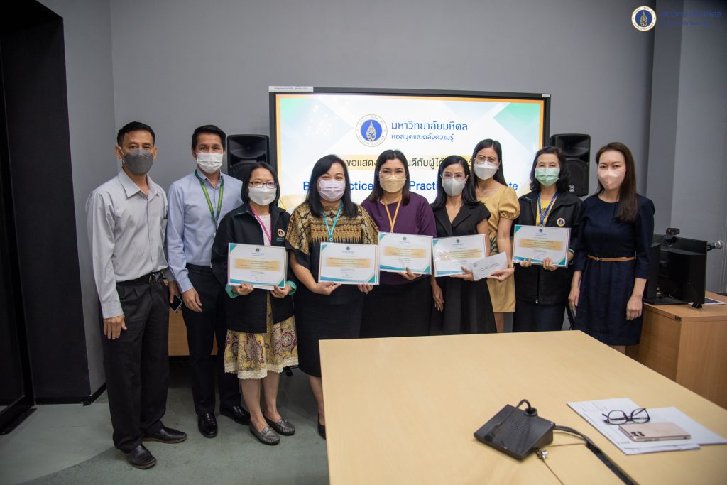 ผู้ที่ได้รับรางวัล Good Practice ได้แก่ คุณนงเยาว์ บุญเจริญ ในหัวข้อ “Library to Classroom@IPSR” คุณจันทรา เทพอวยพร และทีมห้องสมุดวิทยาเขตราชวิถี ในหัวข้อ “ห้องตามประสงค์ (โครงการปรับปรุงห้องบริการอินเทอร์เน็ตให้เป็น Shared Learning Room)” และคุณรุ่งนภา แสงระวี และคุณปัทมา ปานมีทรัพย์ ในหัวข้อ “พัฒนาระบบบริการสารสนเทศเพื่อสนับสนุนการศึกษาและการเรียนรู้ บริการยืมระหว่างห้องสมุดในมหาวิทยาลัยมหิดล (Mahidol Book Delivery)”