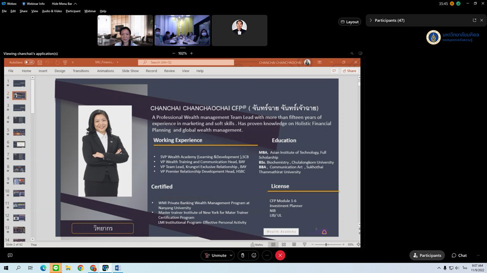 หอสมุดและคลังความรู้มหาวิทยาลัยมหิดล โดย คุณอังคณา อินทรพาณิชย์ รองผู้อำนวยการฝ่ายบริหารและพัฒนาคุณภาพห้องสมุด เป็นประธานกล่าวเปิดกิจกรรม MULKC Fin.ดี Happy Life! ครั้งที่ 2 “ออมทรัพย์ออนไลน์ ดอกเบี้ยสูง” ในวันพุธที่ 9 พฤศจิกายน 2565 ที่ผ่านมา ณ ห้องประชุม Platoon ชั้น 1 อาคารหอสมุดและคลังความรู้ฯ และผ่านระบบการประชุมออนไลน์ Cisco Webex Meeting โดยมีบุคลากรหอสมุดและคลังความรู้ฯ เข้าร่วมกิจกรรมในครั้งนี้จำนวนทั้งสิ้น 55 คน และได้รับเกียรติจาก คุณจันทร์ฉาย จันทร์เจ้าฉาย ผู้อำนวยการ Wealth Learning & Development ธนาคารไทยพาณิชย์ จำกัด (มหาชน) เป็นวิทยากรในหัวข้อ “ทางเลือกในการออม การลงทุน และการประกัน” และคุณณัฎฐพร พึ่งบ้านเกาะ ผู้จัดการธนาคารไทยพาณิชย์ จำกัด (มหาชน) สาขามหาวิทยาลัยมหิดล เป็นวิทยากรในหัวข้อการประกัน และออมทรัพย์ออนไลน์ ดอกเบี้ยสูง นอกจากนี้ได้รับเกียรติจากคุณเขมรุจิ จินดา ผู้จัดการธุรกิจสัมพันธ์ ธนาคารไทยพาณิชย์จำกัด (มหาชน) มาร่วมรับฟังการบรรยายในครั้งนี้ด้วย