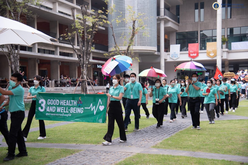 มหาวิทยาลัยมหิดล จัดพิธีเปิดการแข่งขันกีฬาบุคลากรมหาวิทยาลัยมหิดล มหิดลเกมส์ 2566 โดย ศาสตราจารย์ นายแพทย์บรรจง มไหสวริยะ อธิการบดีมหาวิทยาลัยมหิดล เป็นประธานในพิธีฯ และในโอกาสนี้ ผู้ช่วยศาสตราจารย์ ดร.นพพล เผ่าสวัสดิ์ ผู้อำนวยการหอสมุดและคลังความรู้มหาวิทยาลัยมหิดล คุณอังคณา อินทรพาณิชย์ รองผู้อำนวยการฝ่ายบริหารและพัฒนาคุณภาพห้องสมุด ดร.อภิภู สิทธิภูมิมงคล รองผู้อำนวยการฝ่ายเทคโนโลยีการศึกษาและพันธกิจพิเศษ และบุคลากรหอสมุดและคลังความรู้ฯ ได้เข้าร่วมพิธี ในวันศุกร์ที่ 10 มีนาคม 2566 ที่ผ่านมา ณ อาคารศูนย์การเรียนรู้มหิดล (Mahidol Learning Center: MLC) ในการนี้ หอสมุดและคลังความรู้ฯ ได้เข้าร่วมประกวดขบวนพาเหรด ในพิธีเปิดการแข่งขันกีฬาบุคลากรมหาวิทยาลัยมหิดลฯ ภายใต้กรอบแนวคิด Good Health and Well-Being ซึ่งเป็นหนึ่งในเป้าหมายการพัฒนาที่ยั่งยืน (Sustainable Development Goals) โดยมี คุณปภาวรินทร์ ทนโนนแดง บรรณารักษ์ ห้องสมุดวิทยาลัยราชสุดา เป็นผู้ถือป้ายประจำหอสมุดและคลังความรู้ฯ และคุณประมุข หนูเทพย์ วิศวกร หน่วยอาคารสถานที่และยานพาหนะ เป็นผู้ถือธงประจำหอสมุดและคลังความรู้ฯ พร้อมกับบุคลากรหอสมุดและคลังความรู้ฯ เข้าร่วมเดินขบวนพาเหรด เพื่อแสดงถึงความสมัครสมานสามัคคีของบุคลากร ส่งเสริมความแข็งแรงทั้งด้านร่างกายและจิตใจ การรู้แพ้ รู้ชนะ รู้อภัย ซึ่งเป็นหัวใจสำคัญของการเล่นกีฬา