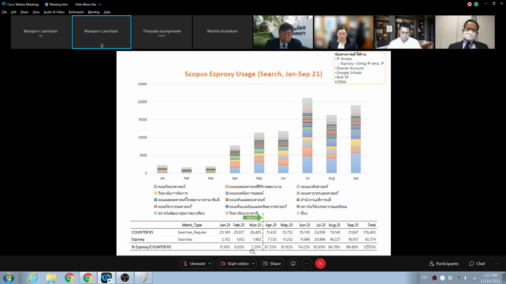 วันพุธที่ 10 พฤศจิกายน 2564 เวลา 13.30 น. หอสมุดและคลังความรู้มหาวิทยาลัยมหิดลจัดการประชุมคณะกรรมการพิจารณาบอกรับฐานข้อมูลและวารสารอิเล็กทรอนิกส์ของมหาวิทยาลัยมหิดล ครั้งที่ 1/2564 ผ่านระบบการประชุมออนไลน์ Cisco Webex Meeting โดยได้รับเกียรติจาก ศาสตราจารย์ นายแพทย์บรรจง มไหสวริยะ อธิการบดีมหาวิทยาลัยมหิดล เป็นที่ปรึกษาคณะกรรมการการประชุมฯ ศาสตราจารย์ นายแพทย์วชิร คชการ รองอธิการบดีฝ่ายวิจัยและวิชาการ เป็นประธานการประชุมฯ และมีผู้เข้าร่วมประชุมประกอบด้วย รองศาสตราจารย์ ดร.เภสัชกรหญิงจุฑามณี สุทธิสีสังข์ รองอธิการบดี รองศาสตราจารย์ ดร.เภสัชกรเนติ สุขสมบูรณ์ รองอธิการบดีฝ่ายการศึกษา ผู้ช่วยศาสตราจารย์ ดร.ธัชวีร์ ลีละวัฒน์ รองอธิการบดีฝ่ายสารสนเทศและวิทยาเขตกาญจนบุรี คณบดีจากคณะต่าง ๆ ผู้ช่วยศาสตราจารย์ ดร.นพพล เผ่าสวัสดิ์ ผู้อำนวยการหอสมุดและคลังความรู้มหาวิทยาลัยมหิดล และผู้แทนจากหอสมุดและคลังความรู้ฯ เพื่อพิจารณาเรื่องการบอกรับฐานข้อมูลและวารสารอิเล็กทรอนิกส์ประจำปี 2565