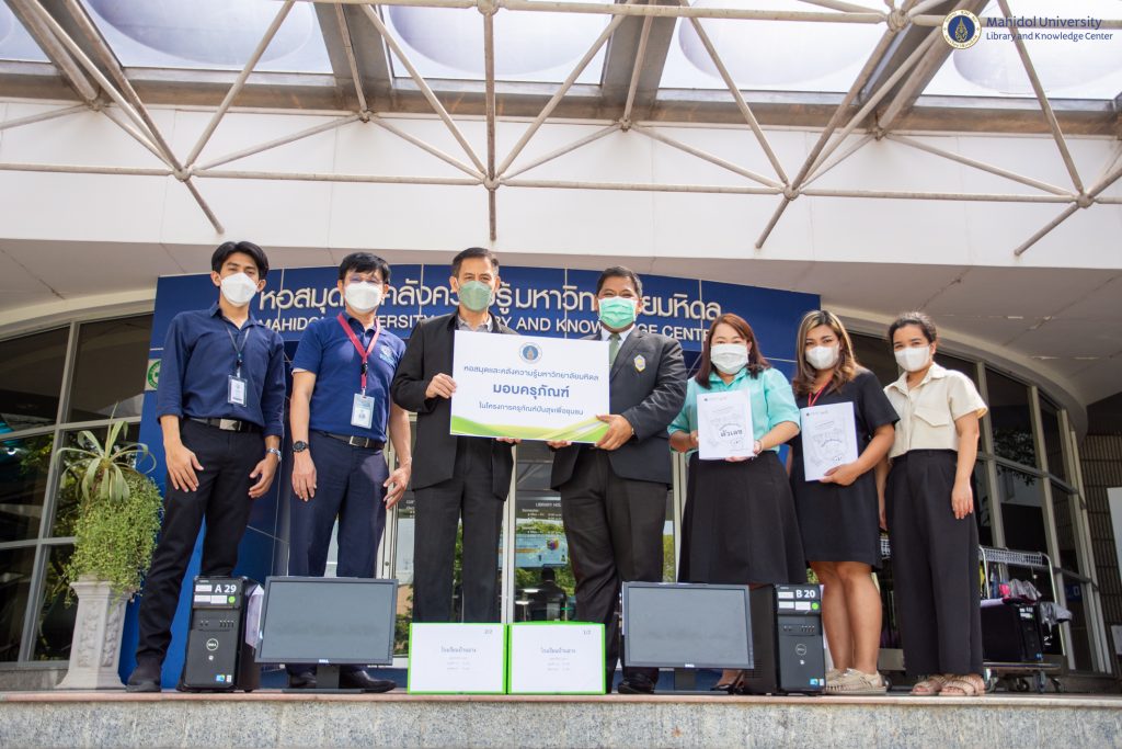 หอสมุดและคลังความรู้มหาวิทยาลัยมหิดล โดย ดร.อภิภู สิทธิภูมิมงคล รองผู้อำนวยการฝ่ายเทคโนโลยีการศึกษาและพันธกิจพิเศษ เป็นประธานส่งมอบอุปกรณ์ทางการศึกษา สมุดทำมือ 4 แบบ และชุดอุปกรณ์คอมพิวเตอร์ ให้กับคุณพงศธร ดำริห์ผู้อำนวยการโรงเรียนบ้านฉาง ในวันพฤหัสบดีที่ 10 พฤศจิกายน 2565 ที่ผ่านมา ณ อาคารหอสมุดและคลังความรู้มหาวิทยาลัยมหิดล ศาลายา ทั้งนี้เพื่อนำไปใช้ประโยชน์ในการปฏิบัติราชการของโรงเรียนดังกล่าวต่อไป ซึ่งเป็นหนึ่งในโครงการพันธกิจเพื่อสังคม และโครงการหอสมุดและคลังความรู้มหาวิทยาลัยมหิดล ปันสุข ครุภัณฑ์ เพื่อชุมชน