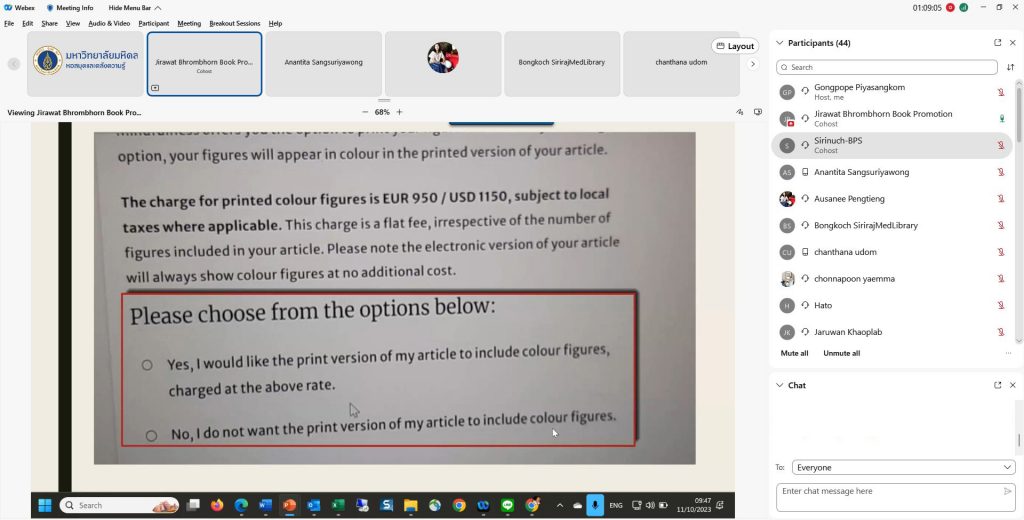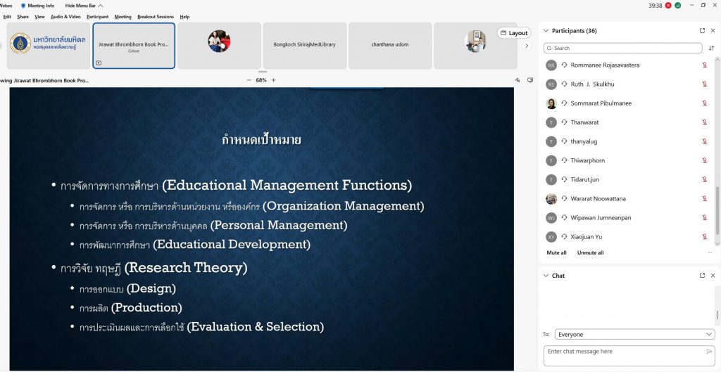 หอสมุดและคลังความรู้มหาวิทยาลัยมหิดล โดย งานพัฒนาทรัพยากรวารสาร ฝ่ายเทคนิคห้องสมุด ได้จัดอบรมในหัวข้อ “กลยุทธ์การเลือกวารสารนานาชาติเพื่อการตีพิมพ์” โดย ได้รับเกียรติจาก คุณจิรวัฒน์ พรหมพร บริษัท บุ๊คโปรโมชั่นแอนด์เซอร์วิส เป็นวิทยากรบรรยายให้ความรู้ในครั้งนี้ เมื่อวันศุกร์ที่ 3 พฤศจิกายน 2566 ผ่านระบบออนไลน์โปรแกรม Cisco Webex Meeting ซึ่งมีผู้สนใจเข้าร่วมการอบรมทั้งสิ้นจำนวน 44 คน โดยการอบรมครั้งนี้มีวัตถุประสงค์เพื่อส่งเสริมทักษะการเลือกวารสารนานาชาติ เครื่องมือ ฐานข้อมูล สำหรับการตีพิมพ์บทความวิชาการ เพื่อให้บุคลากรมหาวิทยาลัยมหิดลปฏิบัติงานวิจัยได้อย่างมีประสิทธิภาพมากขึ้น