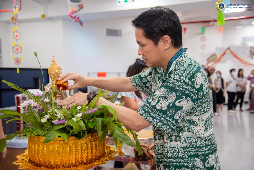 11 เมษายน 2567 ณ อาคารหอสมุดและคลังความรู้มหาวิทยาลัยมหิดล ศาลายา ภายในงาน ประกอบด้วย การสรงน้ำพระพุทธรูป เจิมพื้นที่สำนักงานชั้น 3 (พื้นที่ปรับปรุงใหม่) การรดน้ำขอพรจากคณะผู้บริหารฯ เพื่อเป็นสิริมงคล จากนั้นเป็นการจัดกิจกรรม “สนุกสุขสันต์ คู่ขวัญวันสงกรานต์ 2567” ในช่วงเทศกาลวันสงกรานต์ เพื่อสืบสานประเพณีวัฒนธรรมไทยให้คงอยู่สืบไป