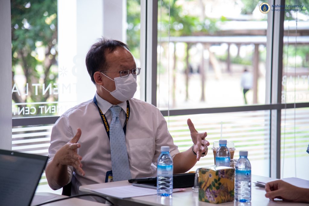 หอสมุดและคลังความรู้ฯ โดยผู้ช่วยศาสตราจารย์ ดร.นพพล เผ่าสวัสดิ์ ผู้อำนวยการหอสมุดและคลังความรู้ฯ เข้าร่วมการประชุมกับ รองศาสตราจารย์ ดร.พลังพล คงเสรี คณบดีคณะวิทยาศาสตร์ พร้อมด้วย คุณวรัษยา สุนทรศารทูล ผู้ช่วยคณบดีฝ่ายการเปลี่ยนผ่านสู่ระบบดิจิทัล เพื่อหารือเรื่องการพิจารณาบอกรับวารสารและฐานข้อมูลอิเล็กทรอนิกส์ ปีงบประมาณ 2566 ณ ห้อง SCB Investment Lab อาคารหอสมุดและคลังความรู้มหาวิทยาลัยมหิดล เมื่อวันพฤหัสบดีที่ 11 สิงหาคม 2565 ที่ผ่านมา