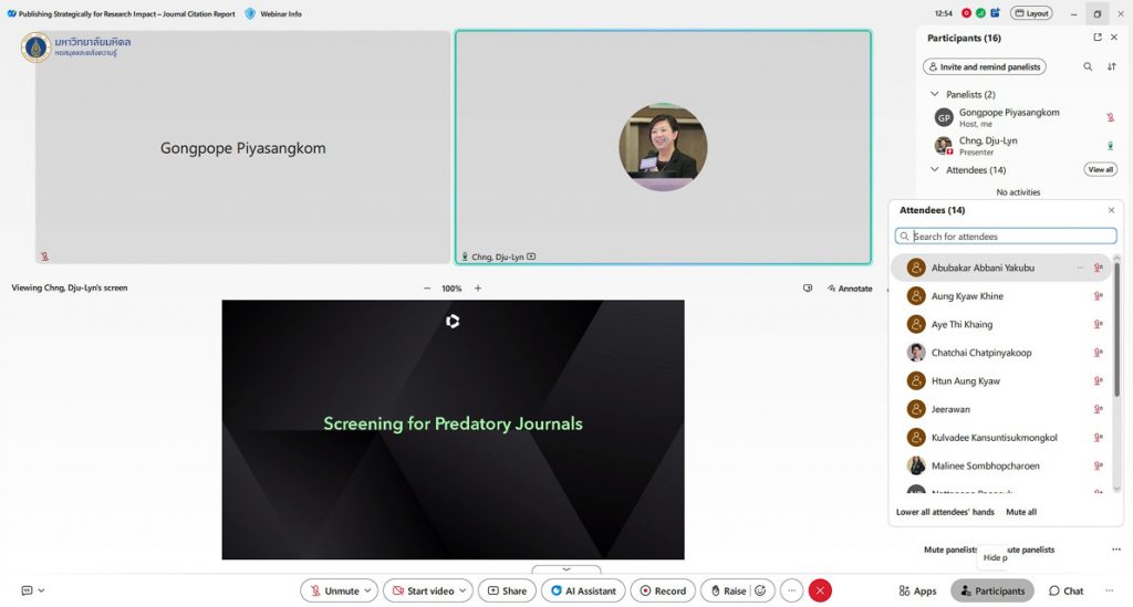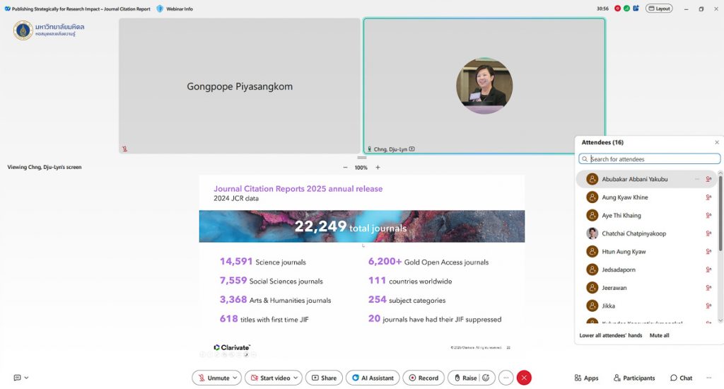หอสมุดและคลังความรู้มหาวิทยาลัยมหิดล จัดอบรมการใช้งานฐานข้อมูล Journal Citation Report เพื่อช่วยวางกลยุทธ์การเลือกวารสารและเพิ่มศักยภาพการตีพิมพ์งานวิจัย โดยได้รับเกียรติจาก Dju-Lyn CHNG, Strategic Customer Success Consultant จาก Clarivate เป็นวิทยากรบรรยายให้ความรู้เกี่ยวกับการใช้งานฐานข้อมูล Journal Citation Report แนวปฏิบัติสำหรับการใช้ Impact Factor และ Journal Citation Indicator เพื่อการประเมินวารสาร การเปรียบเทียบวารสารและการเลือกวารสารที่เหมาะสมที่สุดสำหรับส่งบทความ ให้แก่นักศึกษา อาจารย์ นักวิจัย และบุคลากรมหาวิทยาลัยมหิดล ในวันพฤหัสบดีที่ 11 ธันวาคม พ.ศ. 2568 ในรูปแบบออนไลน์ผ่านระบบ Webex Meeting