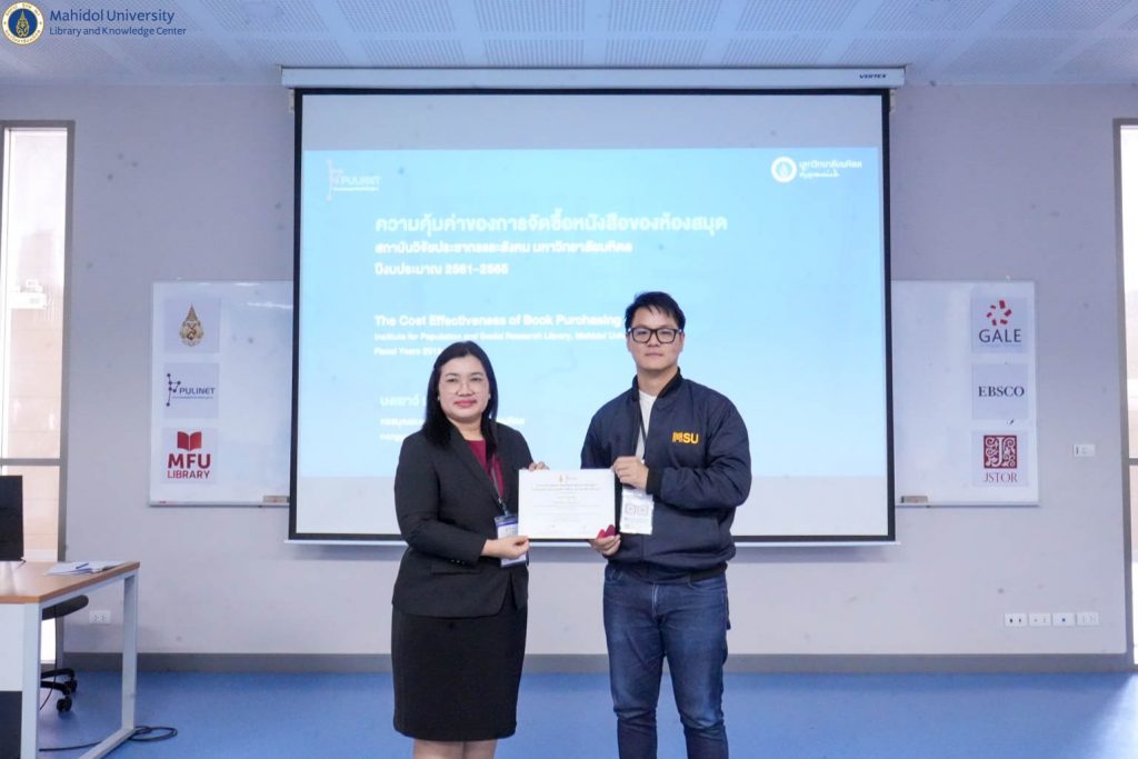 1.ความคุ้มค่าของการจัดซื้อหนังสือของห้องสมุดสถาบันวิจัยประชากรและสังคม มหาวิทยาลัยมหิดล ปีงบประมาณ 2561-2565 โดย คุณนงเยาว์ บุญเจริญ หัวหน้าห้องสมุดสถาบันวิจัยประชากรและสังคม