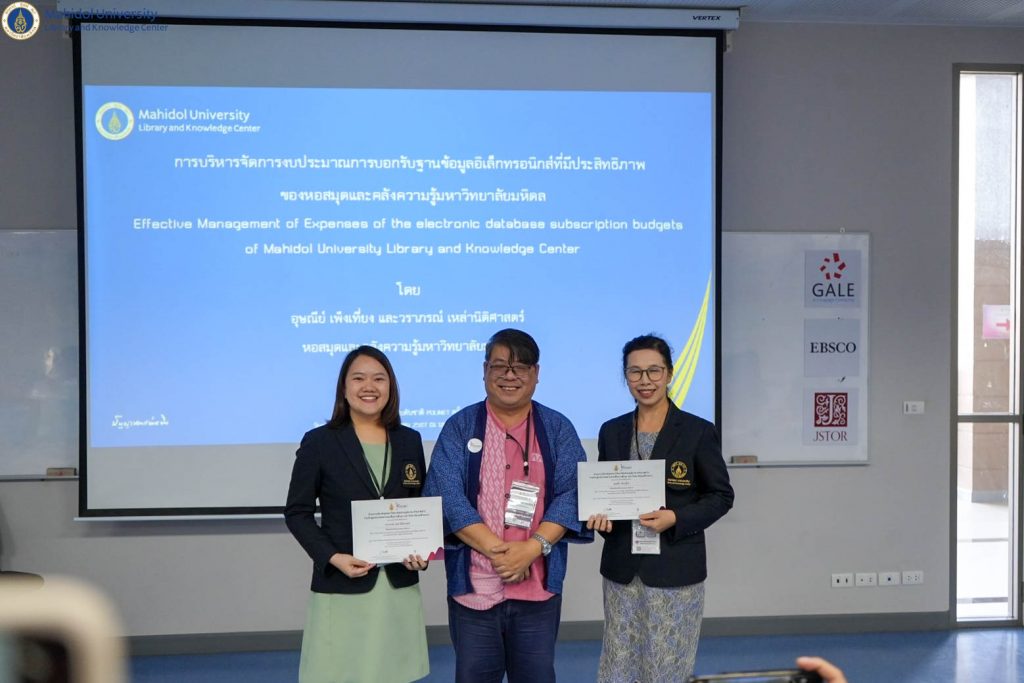 2.การบริหารจัดการงบประมาณการบอกรับฐานข้อมูลอิเล็กทรอนิกส์ที่มีประสิทธิภาพของหอสมุดและคลังความรู้มหาวิทยาลัยมหิดล โดย คุณอุษณีย์ เพ็งเที่ยง หัวหน้างานพัฒนาทรัพยากรวารสาร และคุณวราภรณ์ เหล่านิติศาสตร์ นักเอกสารสนเทศ งานพัฒนาทรัพยากรวารสาร