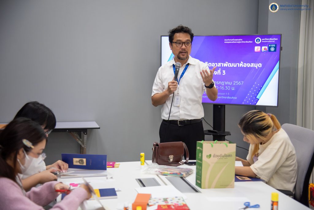 หอสมุดและคลังความรู้มหาวิทยาลัยมหิดล โดย ผู้ช่วยศาสตราจารย์ ดร.สราวุธ เวชกิจ ผู้อำนวยการหอสมุดและคลังความรู้มหาวิทยาลัยมหิดล เป็นประธานกล่าวเปิดกิจกรรม “CSR Day วันจิตอาสาพัฒนาห้องสมุด ครั้งที่ 3” ณ บริเวณ Co-MU Space ชั้น 1 อาคารหอสมุดและคลังความรู้ฯ โดยกำหนดจัดกิจกรรมการเตรียมความพร้อมของทรัพยากรหนังสือเพื่อการนำออกให้บริการ ได้แก่ การทำใบรองปก การติดบาร์โค้ด และการติดใบกำหนดส่ง เพื่อเป็นส่วนหนึ่งในโครงการพัฒนาห้องสมุดดิจิทัลสภาประมุขแห่งบาทหลวงโรมันคาทอลิกแห่งประเทศไทย ซึ่งเป็นห้องสมุดที่รวบรวมทรัพยากรหนังสือด้านศาสนาคริสต์ รวมถึงศาสนาต่าง ๆ มากที่สุดในประเทศไทย รวมถึงมีการจัดกิจกรรมออกแบบระบายสีกระดาษ สำหรับติดถุงกระดาษใส่ยา เพื่อนำไปมอบให้สถานพยาบาลโดยรอบมหาวิทยาลัยมหิดล กิจกรรมในครั้งนี้มีวัตถุประสงค์เพื่อเปิดโอกาสให้ นักเรียน นักศึกษาและบุคลากรมหาวิทยาลัยมหิดล ตลอดจนผู้ที่สนใจได้เข้าร่วมกิจกรรมจิตอาสา และมีส่วนร่วมในการพัฒนาห้องสมุดอย่างยั่งยืนในอนาคต