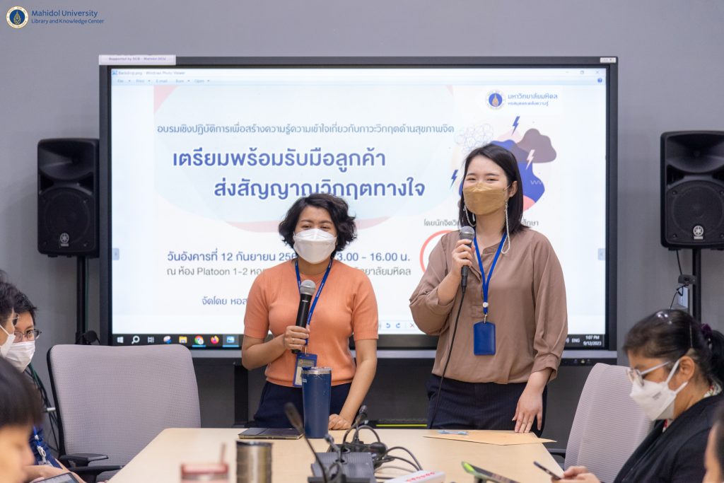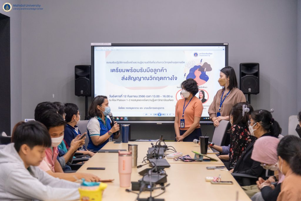 หอสมุดและคลังความรู้มหาวิทยาลัยมหิดล โดย ผู้ช่วยศาสตราจารย์ ดร.นพพล เผ่าสวัสดิ์ ผู้อำนวยการหอสมุดและคลังความรู้ฯ เป็นประธานกล่าวเปิดการอบรมเชิงปฏิบัติการเพื่อสร้างความรู้ความเข้าใจเกี่ยวกับภาวะวิกฤตด้านสุขภาพจิต ในหัวข้อ “เตรียมพร้อมรับมือลูกค้า ส่งสัญญาณวิกฤตทางใจ” เมื่อวันอังคารที่ 12 กันยายน 2566 ที่ผ่านมา ณ ห้อง The Platoon หอสมุดและคลังความรู้มหาวิทยาลัยมหิดล โดยได้รับเกียรติจาก คุณแกมแก้ว โบษกรนัฏ และคุณนันทนัช เตชะอาภรณ์กุล นักจิตวิทยาจากกองกิจการนักศึกษา มหาวิทยาลัยมหิดล เป็นวิทยากรบรรยายให้ความรู้ในครั้งนี้ ซึ่งมีบุคลากรหอสมุดและคลังความรู้ฯ ผู้ปฏิบัติงานห้องสมุด เข้ารับฟังจำนวน 25 ท่าน เพื่อเตรียมความพร้อมรับมือกับผู้ใช้บริการ ที่ส่งสัญญาณภาวะวิกฤตทางจิตใจ วิธีการรับมือ และการปฏิบัติกับผู้ที่มีภาวะวิกฤตทางจิตใจอย่างเหมาะสม