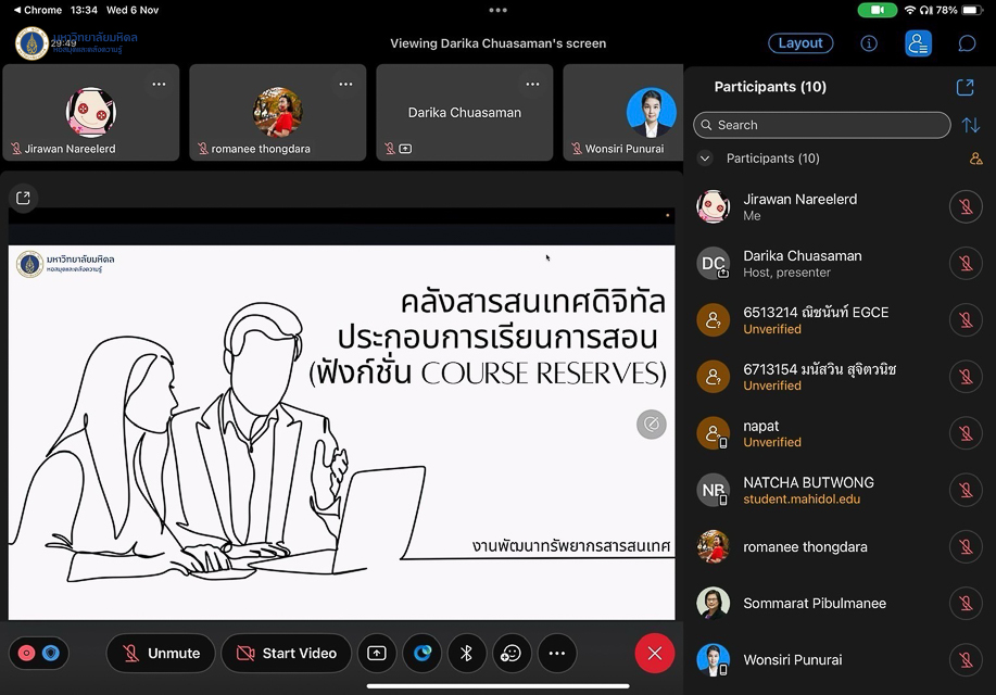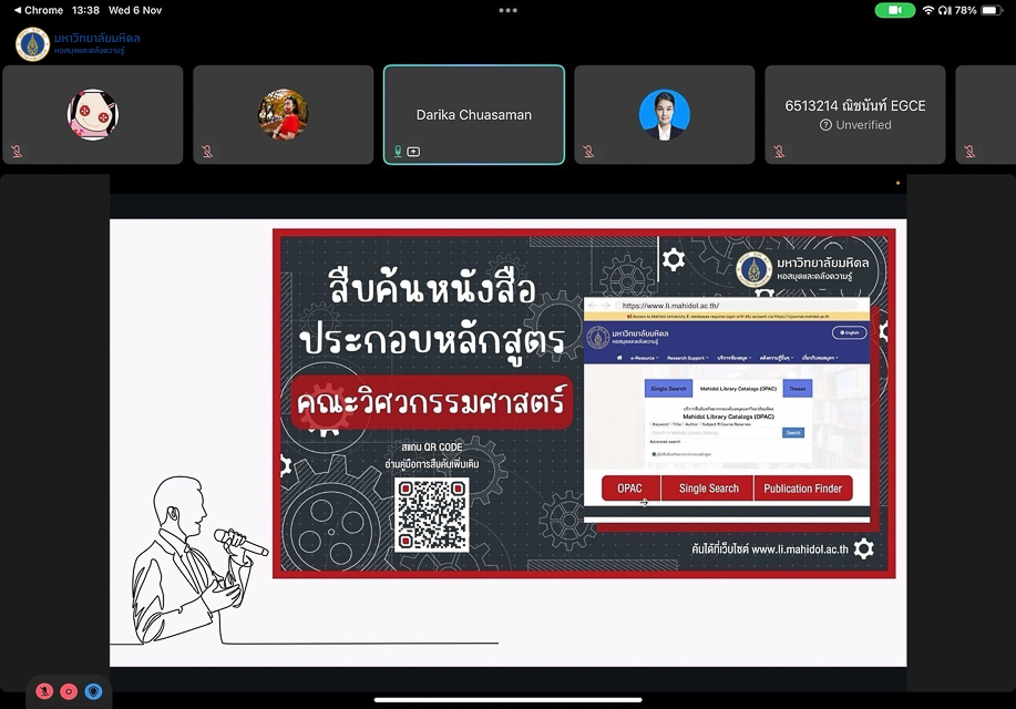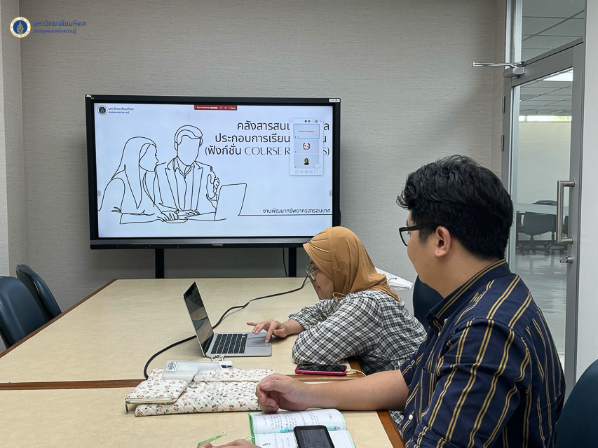 หอสมุดและคลังความรู้มหาวิทยาลัยมหิดล ดำเนินการจัดอบรมการใช้งานคลังสารสนเทศดิจิทัลประกอบการเรียนการสอน (ฟังก์ชั่น Course Reserves) ให้กับนักศึกษาและอาจารย์จากคณะวิศวกรรมศาสตร์ มหาวิทยาลัยมหิดล จำนวน 72 คน โดยวิทยากรคุณดาริกา เชื้อสมัน บรรณารักษ์ งานพัฒนาทรัพยากรสารสนเทศ คุณจิรวรรณ นารีเลิศ นักเอกสารสนเทศชำนาญการ งานพัฒนาทรัพยากรวารสาร และคุณวิชยุตม์ ธนกิติธรรม บรรณารักษ์ หอสมุดกลาง ระหว่างวันที่ 16 ตุลาคม, วันที่ 6 และวันที่ 13 พฤศจิกายน พ.ศ. 2567 ในรูปแบบออนไลน์ผ่านระบบ Cisco Webex Meeting ซึ่งการอบรมในครั้งนี้มีวัตถุประสงค์เพื่อประชาสัมพันธ์คลังสารสนเทศดิจิทัลประกอบการเรียนการสอนให้กับนักศึกษา อาจารย์ และบุคลากรมหาวิทยาลัยมหิดล สำหรับสืบค้นรายการทรัพยากรประกอบการเรียนการสอนอย่างมีประสิทธิภาพ โดยโอกาสนี้หอสมุดกลาง ได้นำร่องในหลักสูตรระดับปริญญาตรีของคณะวิศวกรรมศาสตร์ ซึ่งมีหลักสูตรที่ดำเนินการแล้วเสร็จ จำนวน 6 หลักสูตร
