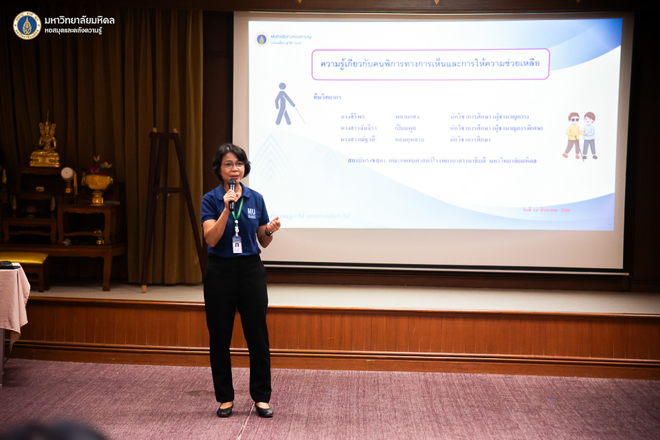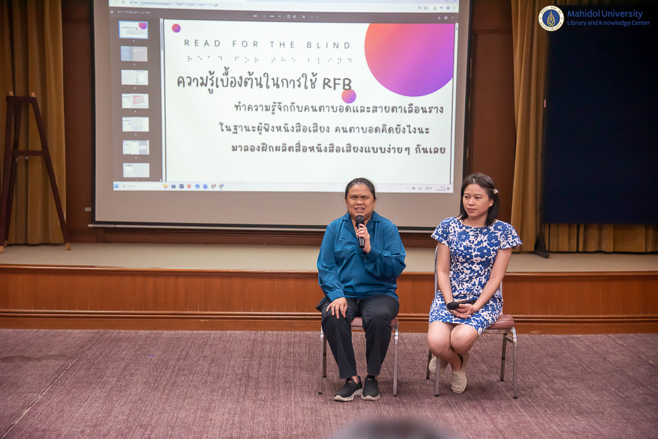 กิจกรรมในครั้งนี้วัตถุประสงค์เพื่อสนับสนุนและส่งเสริมการมีส่วนร่วมของทุกภาคส่วนในการพัฒนาข้อมูลและสื่อการเรียนรู้ต่าง ๆ เพื่อผู้พิการทางสายตาสามารถเข้าถึงได้อย่างเท่าเทียมและมีประสิทธิภาพ ผ่านการฝึกอบรมเชิงปฏิบัติจริงในการสร้างสื่อเสียงที่มีคุณภาพและการให้ความรู้เกี่ยวกับผู้พิการทางสายตา โดยได้รับเกียรติจากมูลนิธิคคนตาบอดไทย นำโดย คุณชลทิพย์ ยิ้มย่อง หัวหน้าฝ่ายดูแลระบบข้อมูลข่าวสารสำหรับคนตาบอด คุณวรุณรดา กรุณี และคุณปภัสรา ฝึกศิลป์ เจ้าหน้าที่ผลิตสื่อเสียงระบบเดซี ห้องสมุดคนตาบอดและผู้พิการทางสื่อสิ่งพิมพ์แห่งชาติ Read for the Blind และวิทยากรจากสถาบันราชสุดา คณะแพทยศาสตร์โรงพยาบาลรามาธิบดี มหาวิทยาลัยมหิดล นำโดย อาจารย์สิรินทรา ฤทธิเดช พร้อมด้วย คุณสุปราณี ศรีสวัสดิ์ คุณสิริพร พลายแสง คุณสจันจิรา เปี่ยมพูล และคุณณัฐวดี หอมกุหลาบ โดยมีนักศึกษาและบุคคลทั่วไปสนใจเข้ารับการอบรมทั้งสิ้น 34 คน