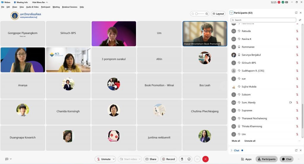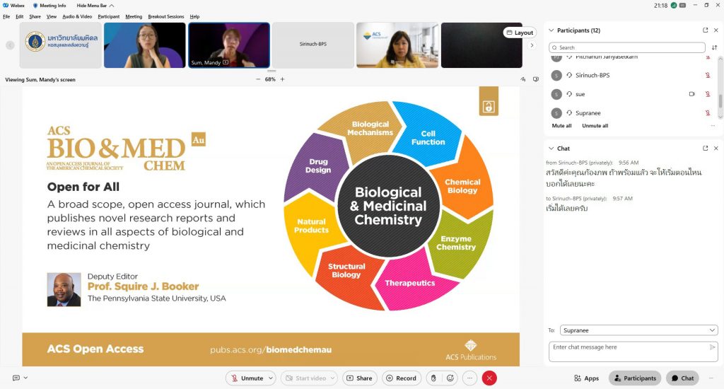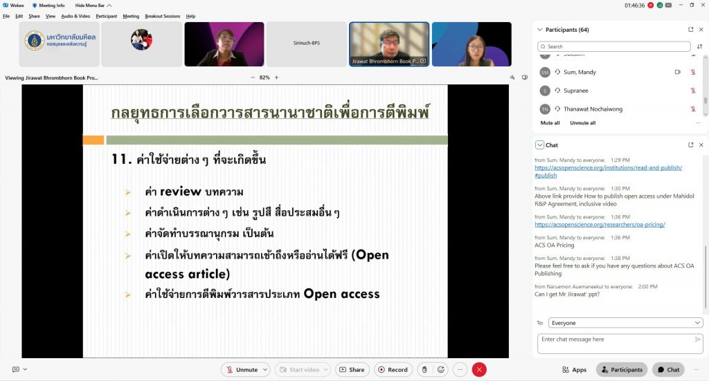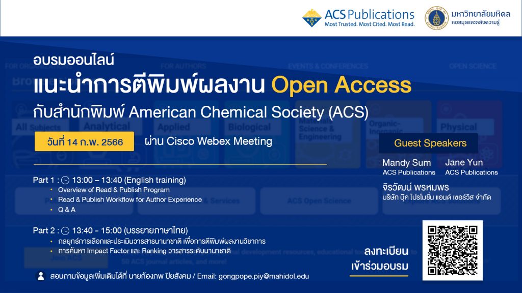 หอสมุดและคลังความรู้มหาวิทยาลัยมหิดล โดย งานพัฒนาทรัพยากรวารสาร ฝ่ายเทคนิคห้องสมุด ได้จัดอบรมบรรยายหัวข้อ “แนะนำการตีพิมพ์ผลงาน Open Access กับสำนักพิมพ์ ACS” โดย ได้รับเกียรติจาก Ms. Mandy Sum และ Ms. Jane Yun จากสำนักพิมพ์ American Chemical Society (ACS) และ คุณจิรวัฒน์ พรหมพร จากบริษัท บุ๊คโปรโมชั่นแอนด์เซอร์วิส เป็นวิทยากรบรรยายให้ความรู้ในครั้งนี้ เมื่อวันอังคารที่ 14 กุมภาพันธ์ 2566 ที่ผ่านมา ผ่านระบบออนไลน์ Cisco WebEx Meeting ซึ่งมีจำนวนผู้เข้าร่วมอบรมทั้งสิ้น 68 คน โดยมีวัตถุประสงค์เพื่อสร้างความเข้าใจในการยื่นตีพิมพ์บทความกับสำนักพิมพ์ ACS และเสริมความรู้ในเรื่องการเลือกวารสารนานาชาติ เพื่อการตีพิมพ์ผลงานวิชาการ