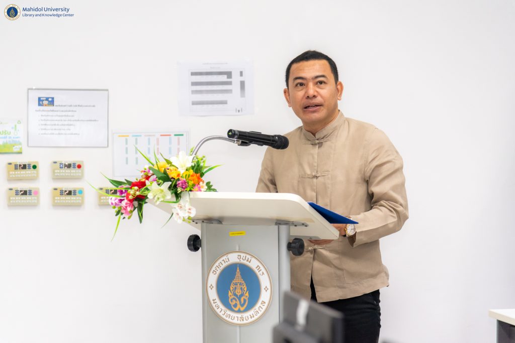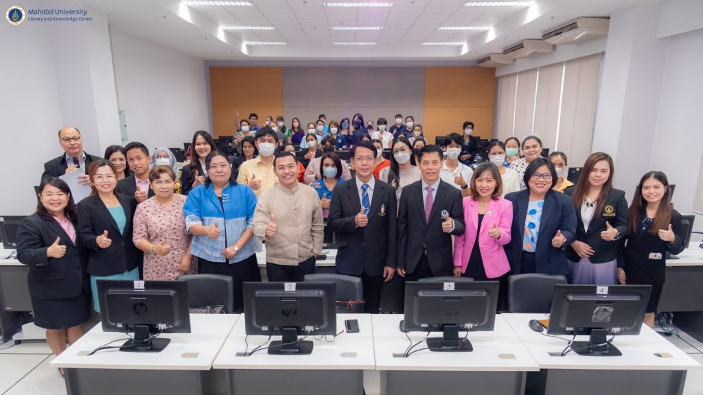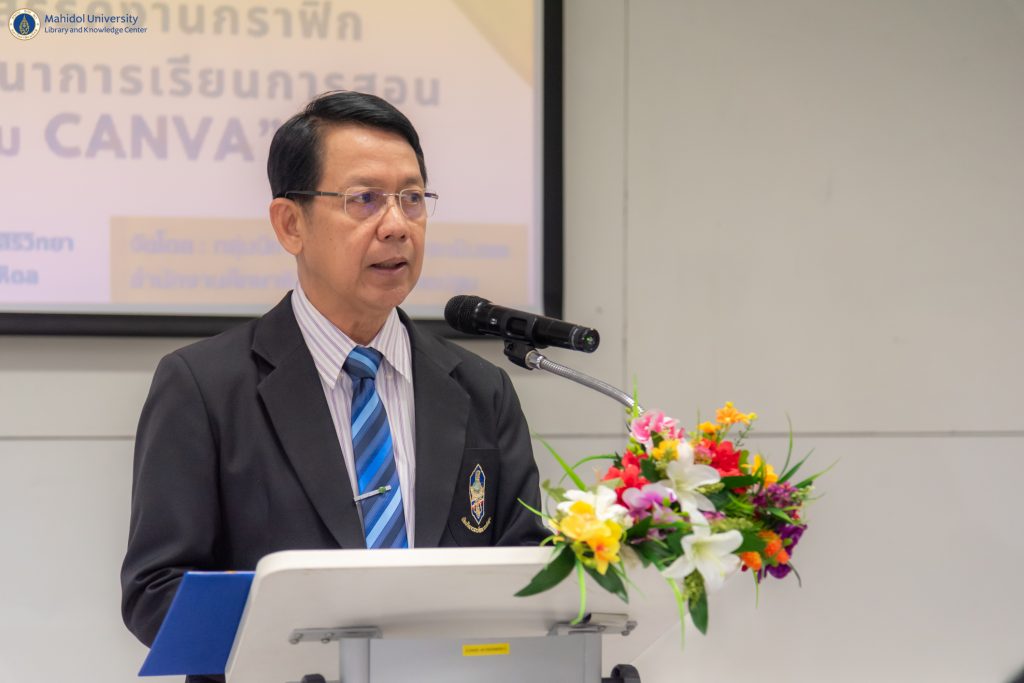 หอสมุดและคลังความรู้มหาวิทยาลัยมหิดล ได้รับเกียรติจาก คุณสไว สารีบท รองศึกษาธิการภาค 2 รักษาการในตำแหน่งศึกษาธิการภาค 2 กล่าวเปิดโครงการอบรมเชิงปฏิบัติการพัฒนาทักษะดิจิทัล “หลักสูตรสร้างสรรค์งานกราฟิกและสื่อวิดีโอเพื่อพัฒนาการเรียนการสอนด้วยโปรแกรม Canva” โดยมี คุณคงกระพัน เวฬุสาโรจน์ ศึกษาธิการจังหวัดนครปฐม กล่าวรายงานวัตถุประสงค์ของโครงการฯ ในโอกาสนี้ ดร.อภิภู สิทธิภูมิมงคล รองผู้อำนวยการฝ่ายเทคโนโลยีการศึกษาและพันธกิจพิเศษ และคุณนภัสวรรณ สุพัตร หัวหน้างานเทคโนโลยีการศึกษา หอสมุดและคลังความรู้ฯ ได้รับเชิญเป็นวิทยากรบรรยายในครั้งนี้ เมื่อวันศุกร์ที่ 14 กรกฎาคม พ.ศ. 2566 ที่ผ่านมา ณ ห้องคอมพิวเตอร์ 416 อาคารสิริวิทยา คณะศิลปศาสตร์ มหาวิทยาลัยมหิดล โดยมีกลุ่มศึกษานิเทศ สำนักงานศึกษาธิการจังหวัดนครปฐม คุณครูและบุคลากรจากโรงเรียนในเครือจังหวัดนครปฐมเข้ารับการอบรมฯ ทั้งสิ้นจำนวน 42 ท่าน โดยเกิดขึ้นจากการทำบันทึกข้อตกลงความร่วมมือ (MOU) ทางวิชาการเพื่อการพัฒนาห้องสมุดดิจิทัล ระหว่างสำนักงานศึกษาธิการจังหวัดนครปฐม กับหอสมุดและคลังความรู้มหาวิทยาลัยมหิดล และโรงเรียนในเครือจังหวัดนครปฐม เพื่อสร้างความรู้ ทักษะ ความเข้าใจและส่งเสริมการออกแบบกระบวนการเรียนรู้เพื่อพัฒนาผู้เรียนในโลกยุคใหม่ และเตรียมความพร้อมสู่ยุคดิจิทัล (Digital Transformation)