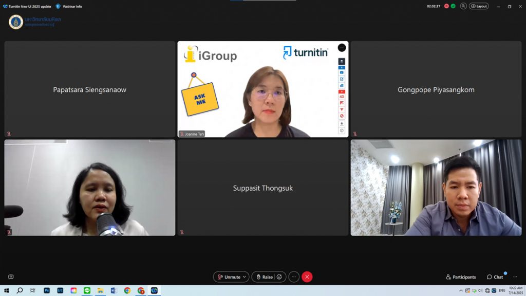 หอสมุดและคลังความรู้มหาวิทยาลัยมหิดล ดำเนินการจัดอบรม “Turnitin New UI 2025 Update” ในวันจันทร์ที่ 14 กรกฎาคม พ.ศ. 2568 ในรูปแบบออนไลน์ผ่านระบบ Cisco Webex Meeting โดยมี คุณ Joanne Teh จากบริษัท iGroup (Asia Pacific) จำกัด พร้อมด้วยหม่อมหลวงรติกร วรวุฒิ หัวหน้าหอสมุดกลาง และคุณศุภสิทธิ ทองสุข นักเอกสารสนเทศ หอสมุดกลาง เป็นวิทยากรบรรยายให้ความรู้กับนักศึกษา อาจารย์ และบุคลากรมหาวิทยาลัยมหิดล จำนวน 289 คน เกี่ยวกับการใช้งานโปรแกรม Turnitin เพื่อตรวจสอบการคัดลอกวิทยานิพนธ์ บทความวิชาการ รวมถึงสาธิตการตรวจจับผลงานที่ถูกเขียนโดยปัญญาประดิษฐ์ และวิธีการสร้างชั้นเรียนและมอบหมายงานอย่างมีประสิทธิภาพ