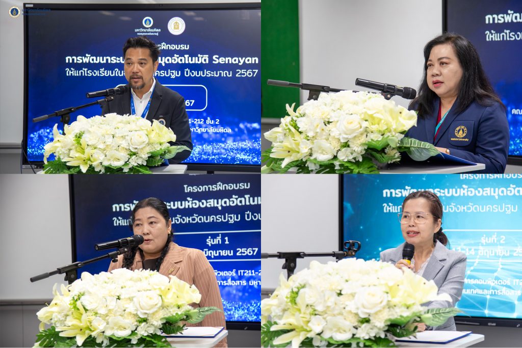 เพื่อเป็นการผลักดันให้โรงเรียนในจังหวัดนครปฐม ให้ก้าวเข้าสู่ระบบห้องสมุดดิจิทัลอย่างเต็มรูปแบบ หอสมุดและคลังความรู้ฯ จึงได้จัดอบรมโครงการพัฒนาระบบห้องสมุดอัตโนมัติ Senayan ให้กับโรงเรียนในเครือข่ายความร่วมมือทางวิชาการฯ ในจังหวัดนครปฐม จำนวนทั้งสิ้น 2 รุ่น ระหว่างวันที่ 11-14 มิถุนายน พ.ศ. 2567 ณ คณะเทคโนโลยีสารสนเทศและการสื่อสาร มหาวิทยาลัยมหิดล ศาลายา โดยมี ผู้ช่วยศาสตราจารย์ ดร.สราวุธ เวชกิจ ผู้อำนวยการหอสมุดและคลังความรู้ฯ เป็นประธานกล่าวเปิดการอบรม พร้อมแขกผู้มีเกียรติ คุณอังคณา อินทรพาณิชย์ รักษาการแทนรองผู้อำนวยการฝ่ายบริหารและพัฒนาคุณภาพ คุณกุลธิดา ปัญญาจิรวุฒิ ผู้อำนวยการกลุ่มนิเทศติดตามและประเมินผล สำนักงานศึกษาธิการจังหวัดนครปฐม คุณจุรีพร แจ้งธรรมมา ศึกษานิเทศก์ชำนาญการพิเศษ คุณจิรประวัติ ศรีวัฒนทรัพย์ ศึกษานิเทศก์ชำนาญการ สำนักงานศึกษาธิการจังหวัดนครปฐม และวิทยากรผู้ทรงคุณวุฒิ จำนวน 9 ท่าน ได้แก่ คุณไพบูลย์ วงษ์ปาน คุณครูโรงเรียนบุณยศรีสวัสดิ์ คุณจุฑาทิพย์ สุกาญจนาเศรษฐ์ กรรมการผู้จัดการ และคุณพสิษฐ์สัทคุณ จุลละมณฑล ประธานเจ้าหน้าที่ฝ่ายปฏิบัติการ บริษัท สยามจุลละมณฑล จำกัด ดร.อภิภู สิทธิภูมิมงคล อดีตรองผู้อำนวยการฝ่ายเทคโนโลยีการศึกษาและพันธกิจพิเศษ คุณปิยธิดา มงคลเนตร์ หัวหน้าห้องสมุดคณะสิ่งแวดล้อมและทรัพยากรศาสตร์ มหาวิทยาลัยมหิดล คุณศกล มงคลเนตร์ เจ้าหน้าที่ระบบงานคอมพิวเตอร์ งานเทคโนโลยีสารสนเทศ คุณอภิชยาภา คูพะเนียด หัวหน้างานวิเคราะห์ทรัพยากรสารสนเทศ คุณสุรศักดิ์ บุตรศรี และคุณนิสากร มณี บรรณารักษ์ งานวิเคราะห์ทรัพยากรสารสนเทศ หอสมุดและคลังความรู้ฯ ซึ่งการจัดทำบันทึกข้อตกลงความร่วมมือ (MOU) ทางวิชาการเพื่อการพัฒนาห้องสมุดดิจิทัล ระหว่างหอสมุดและคลังความรู้มหาวิทยาลัยมหิดล ร่วมกับสำนักงานศึกษาธิการจังหวัดนครปฐม และโรงเรียนในจังหวัดนครปฐม มีวัตถุประสงค์เพื่อส่งเสริมและสนับสนุนความร่วมมือทางวิชาการเพื่อการพัฒนาระบบห้องสมุดดิจิทัล เสริมสร้างการเรียนการสอนของครูและนักเรียน ตลอดจนกิจกรรมเสริมการเรียนรู้ของนักเรียนด้านการจัดการสิ่งแวดล้อมระหว่างหอสมุดและคลังความรู้ฯ และชุมชนโดยรอบมหาวิทยาลัยมหิดล โดยมีเป้าหมายในปีพ.ศ. 2569 กับการให้บริการทางวิชาการเพื่อการพัฒนาห้องสมุดดิจิทัล ให้ครอบคลุมทุกโรงเรียนในจังหวัดนครปฐม