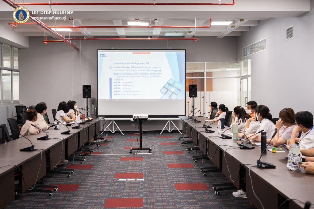 หอสมุดและคลังความรู้มหาวิทยาลัยมหิดล โดย ผู้ช่วยศาสตราจารย์ ดร.นพพล เผ่าสวัสดิ์ ผู้อำนวยการหอสมุดและคลังความรู้มหาวิทยาลัยมหิดล และ ประธานคณะทำงานประเมินคุณธรรมและความโปร่งใสในการดำเนินงานของหอสมุดและคลังความรู้มหาวิทยาลัยมหิดล ดำเนินการจัดประชุมชี้แจงเพื่อขับเคลื่อนการยกระดับการประเมินคุณธรรมและความโปร่งใสในการดำเนินงานของมหาวิทยาลัยมหิดล Mahidol University Integrity and Transparency Assessment (MU ITA) ครั้งที่ 1/2567 ในวันพฤหัสบดีที่ 15 กุมภาพันธ์ พ.ศ. 2567 ณ ห้องประชุม 2 ชั้น 3 อาคารหอสมุดและคลังความรู้มหาวิทยาลัยมหิดล และผ่านระบบออนไลน์ Cisco Webex Meeting เพื่อปรับปรุงและจัดทำข้อมูลสาธารณะสำหรับการประเมินคุณธรรมและความโปร่งใสในการดำเนินงานของหน่วยงานภาครัฐ (Integrity and Transparency Assessment: ITA) ประจำปีงบประมาณ พ.ศ. 2567 ตามนโยบายของสำนักงานคณะกรรมการป้องกันและปราบปรามการทุจริต (สำนักงาน ป.ป.ช.) ตามแผนแม่บทภายใต้ยุทธศาสตร์ชาติ ประเด็นการต่อต้านทุจริตและประพฤติมิชอบ (พ.ศ. 2561-2580)