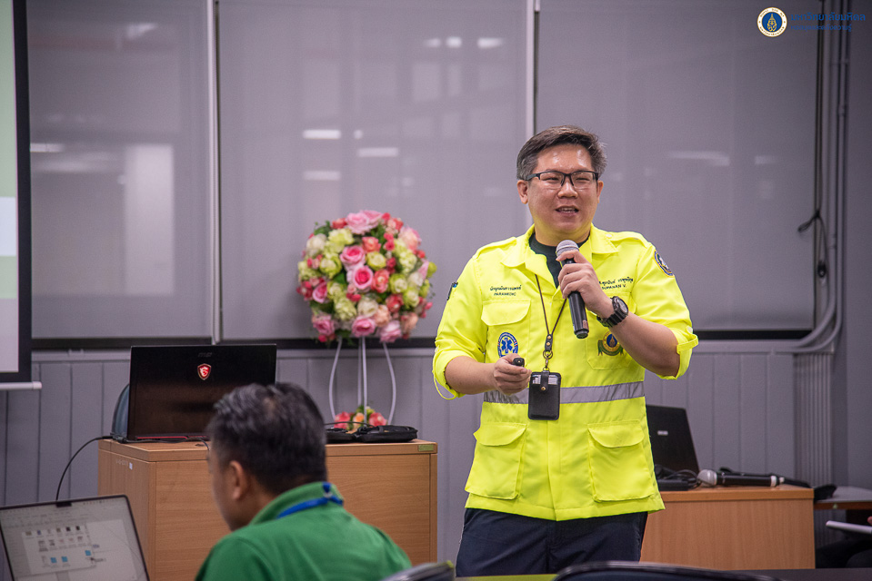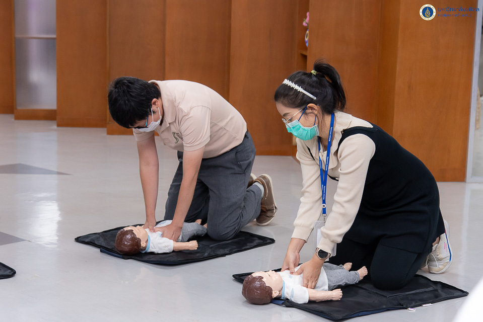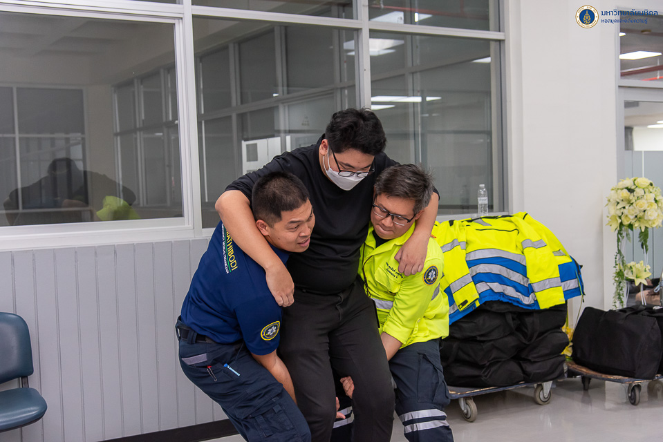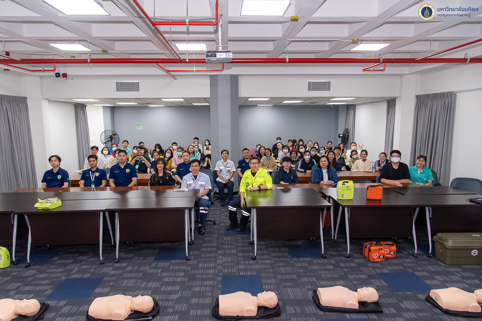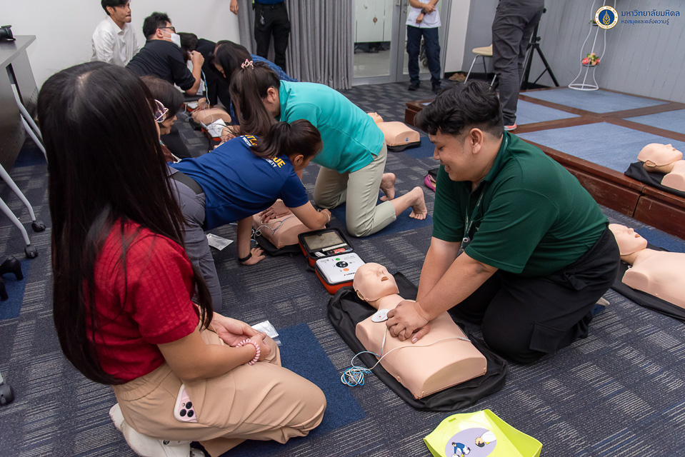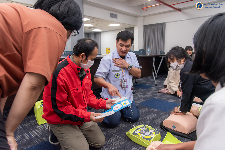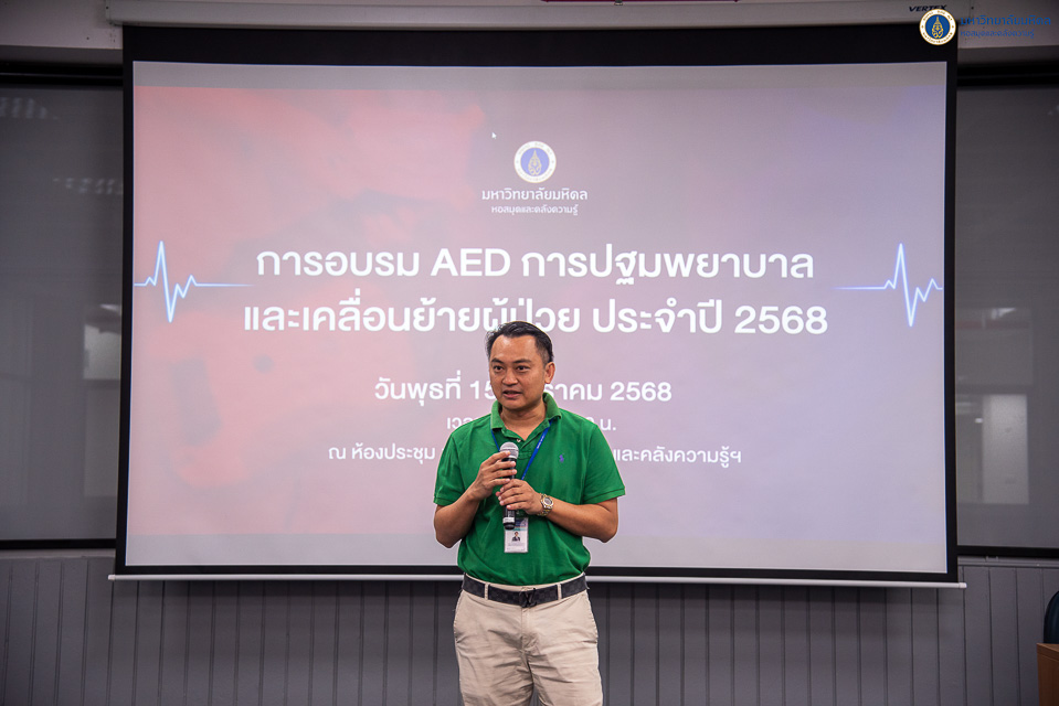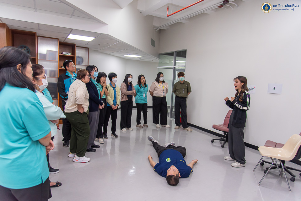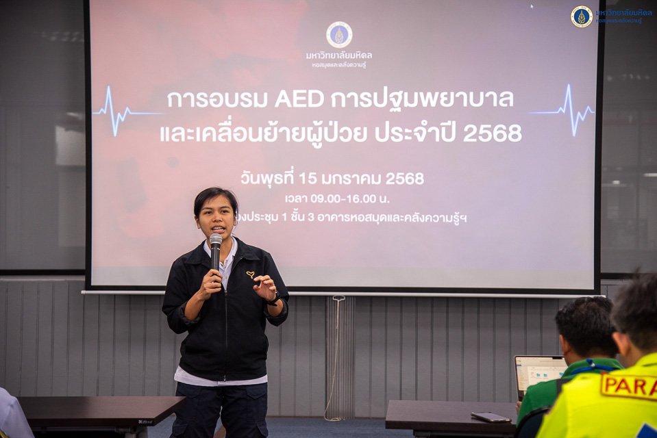 หอสมุดและคลังความรู้มหาวิทยาลัยมหิดล โดย อาจารย์ ดร.เอกชัย วารินศิริรักษ์ รองผู้อำนวยการฝ่ายนวัตกรรมบริการห้องสมุด เป็นประธานกล่าวเปิดโครงการฝึกอบรมเชิงปฏิบัติการปฐมพยาบาล การกู้ชีพ และการเคลื่อนย้ายผู้ป่วยประจำปี 2568 รุ่นที่ 1 และรุ่นที่ 2 ในวันพุธที่ 15 มกราคม พ.ศ. 2568 ณ ชั้น 3 อาคารหอสมุดและคลังความรู้ฯ ศาลายา ในโอกาสนี้ได้รับเกียรติจาก คุณมะลิวัลย์ ผลทับทิม นักปฏิบัติการฉุกเฉินการแพทย์ (ชำนาญการพิเศษ) ภาควิชาเวชศาสตร์ฉุกเฉิน คณะแพทยศาสตร์โรงพยาบาลรามาธิบดี พร้อมด้วยคณะวิทยากรจำนวน 11 ท่าน ร่วมเป็นวิทยากรบรรยายให้ความรู้กับบุคลากรหอสมุดและคลังความรู้ฯ จำนวน 107 คน ในการช่วยฟื้นคืนชีพด้วยการทำ CPR การใช้เครื่องฟื้นคืนคลื่นหัวใจด้วยไฟฟ้าแบบอัตโนมัติ (Automated External Defibrillator: AED) การเคลื่อนย้ายผู้ป่วย และการช่วยเหลืออผู้ป่วยที่มีภาวะอุดกั้นทางเดินหายใจส่วนบน เพื่อส่งเสริมให้บุคลากรหอสมุดและคลังความรู้ฯ สามารถช่วยเหลือผู้ที่ได้รับบาดเจ็บหรือเจ็บป่วยให้พ้นจากอันตรายได้อย่างถูกวิธี และพร้อมรับมือกับสถานการณ์ฉุกเฉินที่อาจเกิดขึ้นได้ตลอดเวลา