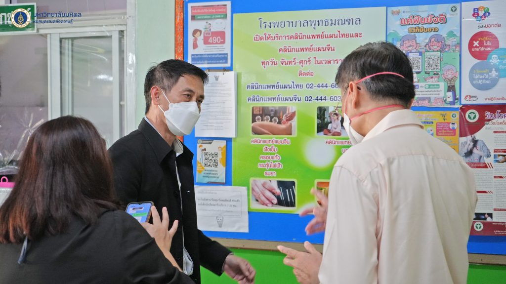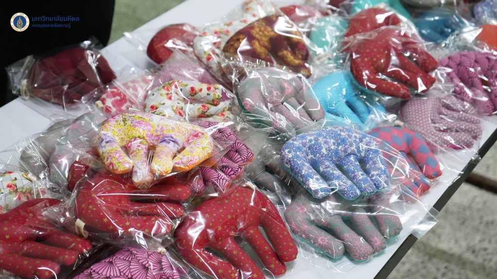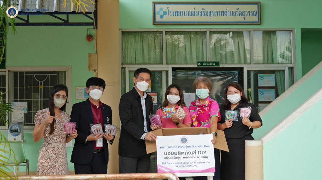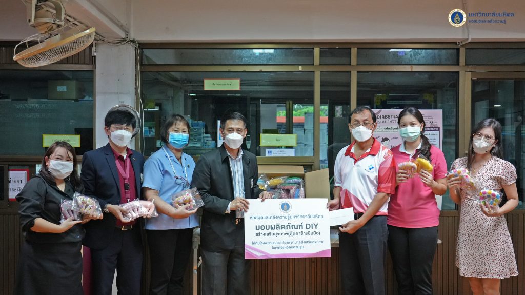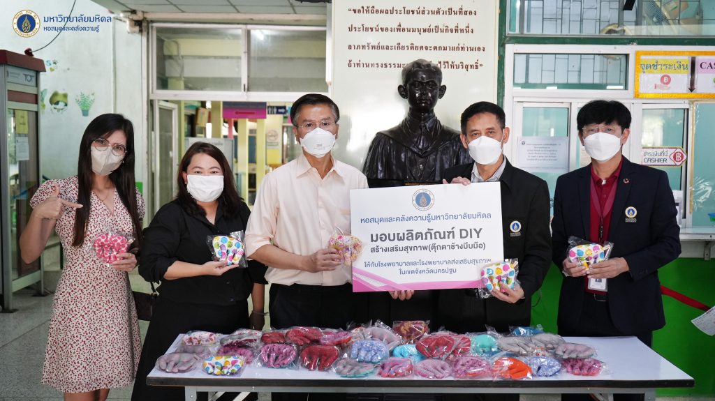 หอสมุดและคลังความรู้มหาวิทยาลัยมหิดล โดย ดร.อภิภู สิทธิภูมิมงคล รองผู้อำนวยการฝ่ายเทคโนโลยีการศึกษาและพันธกิจพิเศษ เป็นผู้แทนหอสมุดและคลังความรู้ฯ ส่งมอบตุ๊กตาช้างบีบมือ สำหรับผู้ป่วยติดเตียง ผู้ที่มีอาการกล้ามเนื้ออ่อนแรง และกลุ่มผู้สูงอายุ จำนวนทั้งสิ้น 180 ตัว ให้กับโรงพยาบาลในเขตอำเภอพุทธมณฑลจำนวน 3 แห่ง แห่งละ 60 ตัว โดยมอบให้กับ นพ.ปริพนท์ จุลเจิม นายแพทย์ชำนาญการพิเศษ รักษาการในตำแหน่ง ผู้อำนวยการโรงพยาบาลพุทธมณฑล คุณสิริลักษณ์ รุ่มนุ่ม พยาบาลวิชาชีพ ปฎิบัติการ ผู้แทนผู้อำนวยการโรงพยาบาลส่งเสริมสุขภาพตำบลวัดสุวรรณ และคุณบรรเจิด รูปสูง ผู้อำนวยการโรงพยาบาลส่งเสริมสุขภาพตำบลบ้านสาลวัน เมื่อวันอังคารที่ 15 พฤศจิกายน 2565 ที่ผ่านมา ทั้งนี้เพื่อนำไปใช้ประโยชน์ในทางการแพทย์ของโรงพยาบาลทั้ง 3 แห่งต่อไป กิจกรรมนี้เป็นส่วนหนึ่งในโครงการพันธกิจเพื่อสังคม ของหอสมุดและคลังความรู้มหาวิทยาลัยมหิดล
