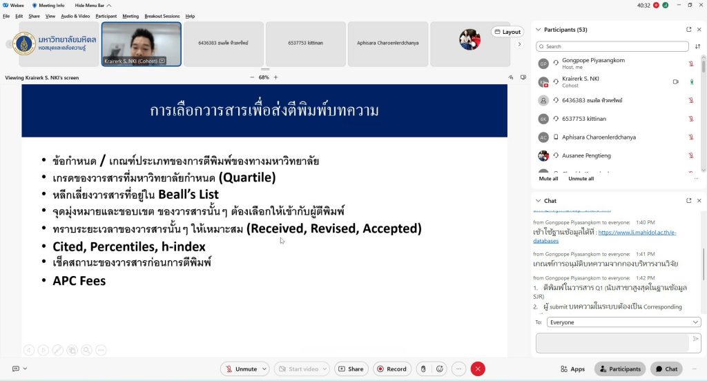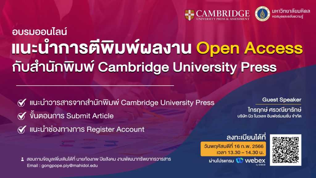หอสมุดและคลังความรู้มหาวิทยาลัยมหิดล โดย งานพัฒนาทรัพยากรวารสาร ฝ่ายเทคนิคห้องสมุด ได้จัดอบรมบรรยายหัวข้อ “แนะนำการตีพิมพ์ผลงาน Open Access กับสำนักพิมพ์ Cambridge University Press” โดย ได้รับเกียรติจาก คุณไกรฤกษ์ ศรวณียารักษ์ จากบริษัท นิว โนวเลจ อินฟอร์มเมชั่น จำกัด เป็นวิทยากรบรรยายให้ความรู้ในครั้งนี้ เมื่อวันพฤหัสบดีที่ 16 กุมภาพันธ์ 2566 ที่ผ่านมา ผ่านระบบออนไลน์ Cisco WebEx Meeting ซึ่งมีจำนวนผู้เข้าร่วมอบรมทั้งสิ้น 51 คน โดยมีวัตถุประสงค์เพื่อแนะนำวารสารจากสำนักพิมพ์ Cambridge University Press ขั้นตอนการส่งบทความเพื่อการตีพิมพ์ ซึ่งอาจารย์และบุคลากรมหาวิทยาลัยมหิดล สามารถตีพิมพ์ได้ไม่จำกัดจำนวนสิทธิ์