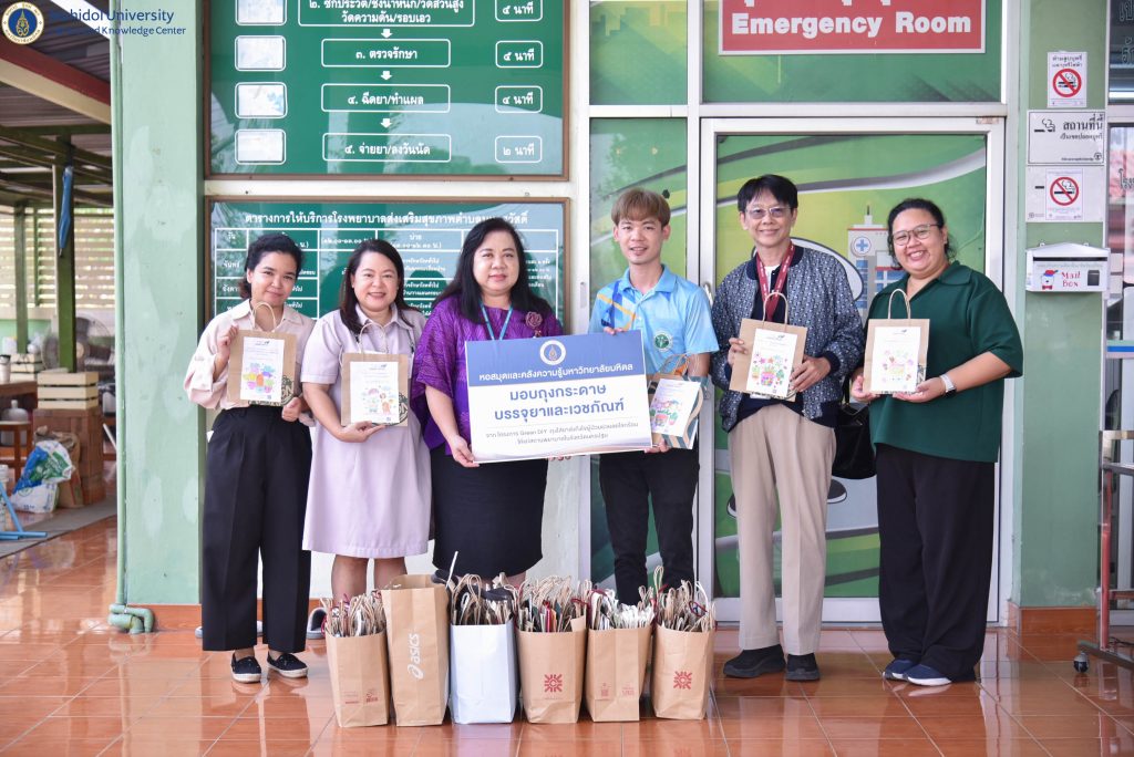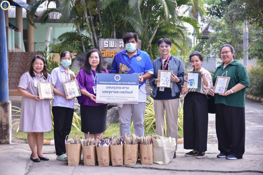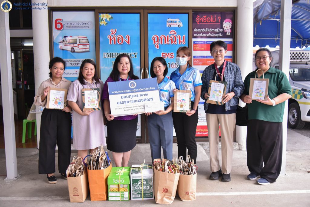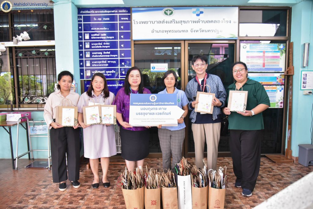 ในวันศุกร์ที่ 16 กุมภาพันธ์ 2567 หอสมุดและคลังความรู้มหาวิทยาลัยมหิดล โดย คุณอังคณา อินทรพาณิชย์ รองผู้อำนวยการฝ่ายบริหารและพัฒนาคุณภาพห้องสมุด เป็นผู้แทนหอสมุดและคลังความรู้ฯ ส่งมอบถุงกระดาษบรรจุยาและเวชภัณฑ์ จำนวน 1,600 ใบ ให้แก่สถานพยาบาลในจังหวัดนครปฐม จำนวน 4 แห่ง โดยมี คุณสุจิตรา พูลสวัสดิ์ ผู้อำนวยการโรงพยาบาลส่งเสริมสุขภาพตำบลคลองโยง 1 (บุญยศรีสวัสดิ์) เป็นผู้แทนรับมอบ คุณอาทิตย์ รอดโพธิ์ทอง ผู้อำนวยการโรงพยาบาลส่งเสริมสุขภาพตำบลวัดสุวรรณ เป็นผู้แทนรับมอบ คุณวิกรม รุจยากรกุล นักวิชาการสาธารณสุขปฏิบัติการ เป็นผู้แทนรับมอบจาก โรงพยาบาลส่งเสริมสุขภาพตำบลมหาสวัสดิ์ และคุณภัทรกุล โชติธรรม เจ้าพนักงานธุรการปฏิบัติงาน เป็นผู้แทนรับมอบจากโรงพยาบาลส่งเสริมสุขภาพตำบลบ้านศาลาวัน โดยโครงการ Green DIY : ถุงใส่ยาส่งถึงใจผู้ป่วยช่วยลดโลกร้อน ให้แก่สถานพยาบาลในจังหวัดนครปฐม เป็นหนึ่งในโครงการพันธกิจสัมพันธ์เพื่อสังคมของหอสมุดและคลังความรู้ฯ เพื่อเสริมสร้างพันธกิจสัมพันธ์เพื่อสังคม ให้กับชุมชนโดยรอบมหาวิทยาลัยมหิดล ซึ่งถุงกระดาษทั้งหมด เป็นการรับบริจาคจากประชาชนทั่วไป โดยได้รับความร่วมมือจากนักเรียน นักศึกษาที่เข้าร่วมในกิจกรรม Workshop ถุงใส่ยาส่งถึงใจผู้ป่วย และจากกิจกรรมไทยสร้างสรรค์ รวมใจกันรักษ์สิ่งแวดล้อม ณ โรงเรียนบ้านลำพยา ที่ผ่านมา