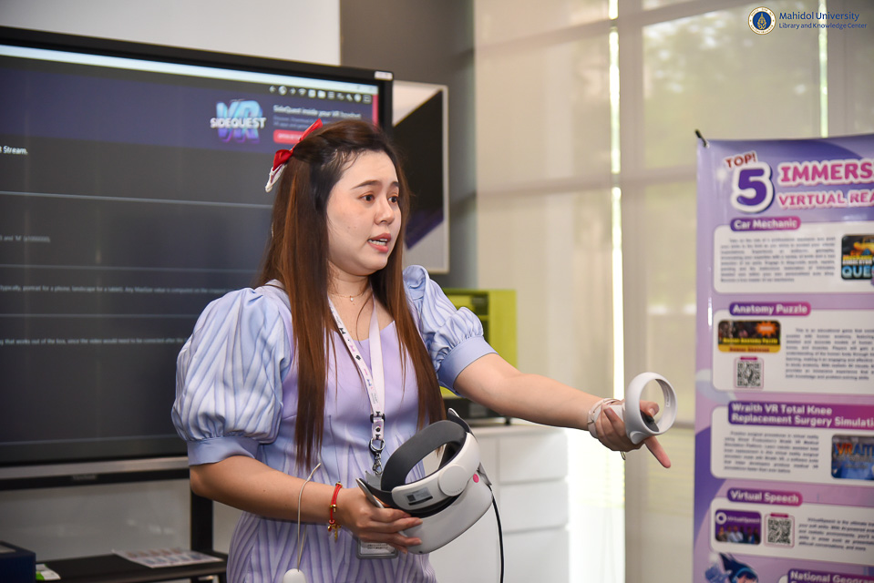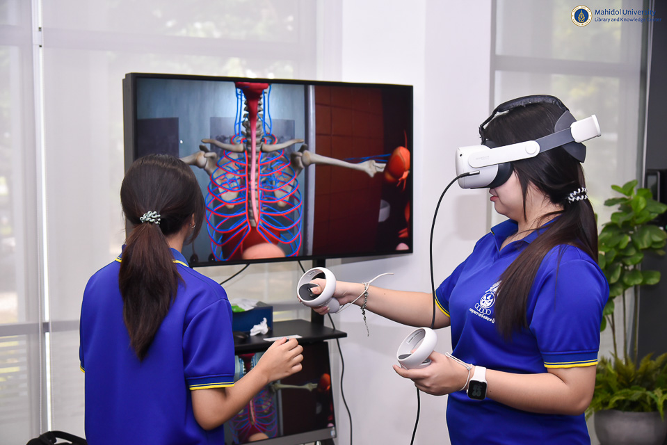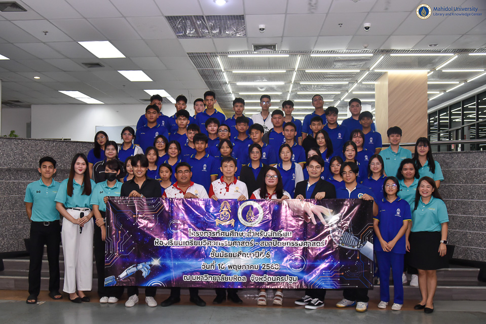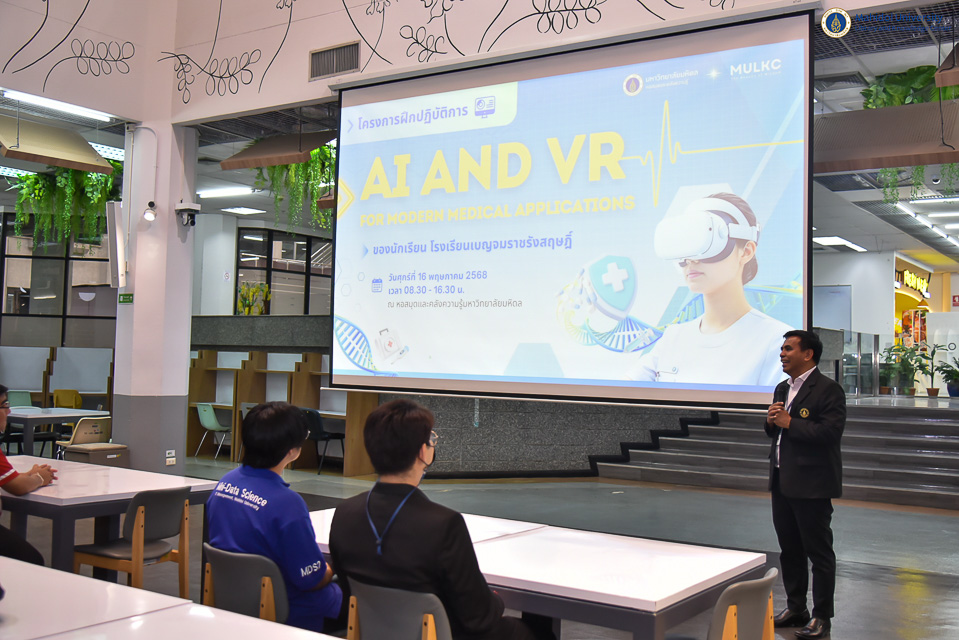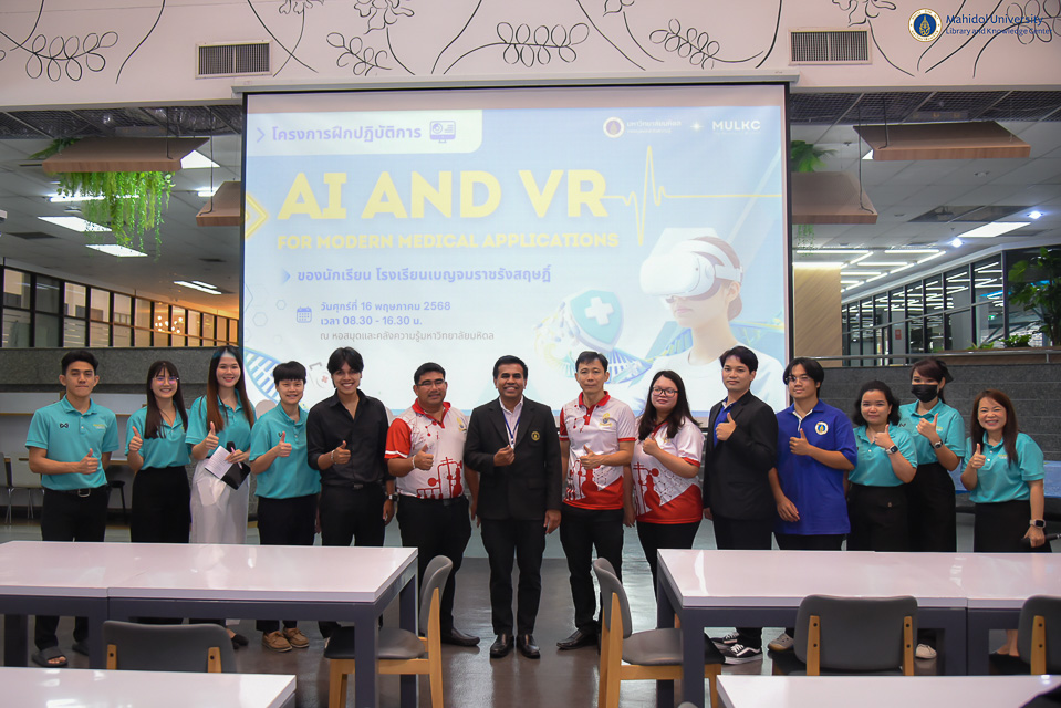 หอสมุดและคลังความรู้มหาวิทยาลัยมหิล โดย ผู้ช่วยศาสตราจารย์ ดร.ทวีศักดิ์ สมานชื่น รองผู้อำนวยการฝ่ายเทคโนโลยีดิจิทัล เป็นประธานกล่าวเปิดโครงการฝึกอบรมปฏิบัติการ AI and VR for Modern Medical Applications ในวันศุกร์ที่ 16 พฤษภาคม พ.ศ. 2568 ณ อาคารหอสมุดและคลังความรู้ฯ (ศาลายา) พร้อมมอบเกียรติบัตรให้กับนักเรียน จำนวน 40 คน จากโรงเรียนเบญจมราชรังสฤษฎิ์ จังหวัดฉะเชิงเทรา นำโดย คุณเสรี อังศิริ หัวหน้าโครงการห้องเรียนวิศวกรรมศาสตร์และปัญญาประดิษฐ์ คุณพัทธนันท์ ศรีเจริญรักษ์ รองหัวหน้าโครงการห้องเรียนวิศวกรรมศาสตร์และปัญญาประดิษฐ์ และคุณจุฬาลักษณ์ จำปาเทศ กรรมการโครงการห้องเรียนวิศวกรรมศาสตร์และปัญญาประดิษฐ์ โดยกิจกรรมในครั้งนี้เป็นการอบรมฝึกปฏิบัติการในหัวข้อ “Reverse Technology” วิทยากรโดย คุณประดุจเทพ มณีฉาย นักวิจัย FlexLAB การอบรมในหัวข้อ “AI for All” วิทยากรโดยคุณกิติธร ยางแดง และคุณอัครพนธ์ ชัยโคตร ศูนย์บริหารการจัดการองค์กรสากล กลุ่มสาขาวิชาเทคโนโลยีการจัดการร ะบบสารสนเทศ คณะวิศวกรรมศาสตร์มหาวิทยาลัยมหิดล พร้อมด้วยการอบรมในหัวข้อ “VR for Medical Education” วิทยากรโดยคุณนภัสวรรณ สุพัตร นักวิชาการโสตทัศนศึกษา (ผู้ชำนาญการพิเศษ) งานเทคโนโลยีการศึกษา ซึ่งหอสมุดและคลังความรู้ฯ ได้ประยุกต์ใช้วิทยาการด้านเทคโนโลยีดิจิทัลที่เป็นเทคโนโลยีอุบัติใหม่ (Emerging Technology) ในการปฏิวัติอุตสาหกรรมครั้งที่ 5 (Industry 5.0) สำหรับการอบรมฝึกปฏิบัติการในครั้งนี้เพื่อวัตถุประสงค์ส่งเสริมการจัดการเรียนการสอนด้านการแพทย์สมัยใหม่ด้วยเทคโนโลยีได้อย่างมีประสิทธิภาพ ซึ่งเป็นทักษะที่นักเรียนพึงมีในรอบ 1 ทศวรรษนี้ เพื่อตอบสนองต่อความต้องการในระดับโลกต่อไปในอนาคต