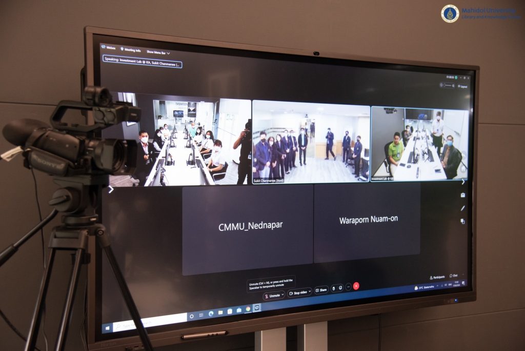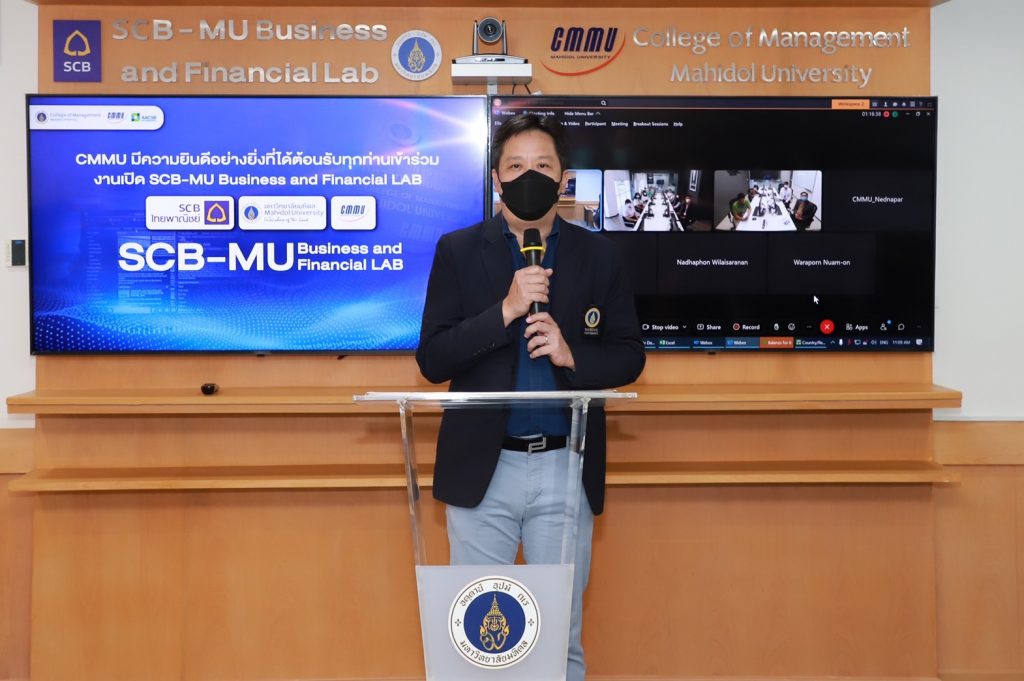 มหาวิทยาลัยมหิดล โดย ผู้ช่วยศาสตราจารย์ ร.ท. ทพ.ชัชชัย คุณาวิศรุต รองอธิการบดีฝ่ายกิจการนักศึกษาและศิษย์เก่าสัมพันธ์ มหาวิทยาลัยมหิดล เป็นประธานเปิด “SCB-MU Business and Financial LAB” ในโอกาสนี้ รองศาสตราจารย์ ดร.วิชิตา รักธรรม คณบดีวิทยาลัยการจัดการ กล่าวรายงานและวัตถุประสงค์ของโครงการ โดย ดร.อภิภู สิทธิภูมิมงคล รองผู้อำนวยการฝ่ายเทคโนโลยีการศึกษาและพันธกิจพิเศษ หอสมุดและคลังความรู้ฯ ได้รับเกียรติในการเข้าร่วมพิธีเปิดงานในครั้งนี้ ซึ่งได้ถ่ายทอดพิธีเปิดงานฯ ผ่านระบบออนไลน์ ณ ห้อง SCB Investment Lab ชั้น 1 อาคารหอสมุดและคลังความรู้มหาวิทยาลัยมหิดล ศาลายา เมื่อวันที่ 17 สิงหาคม 2565 ที่ผ่านมา
