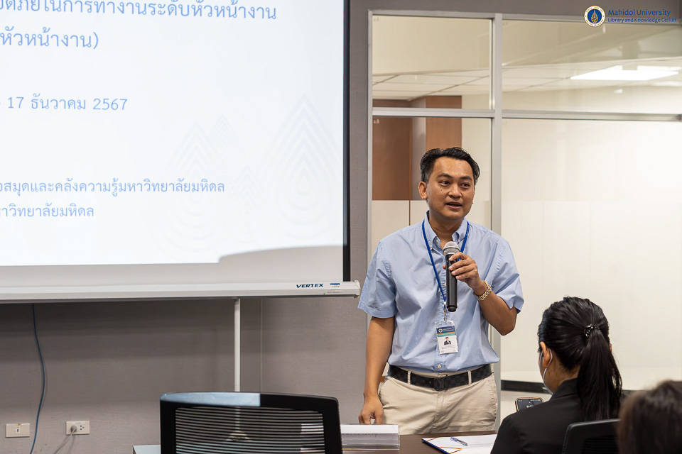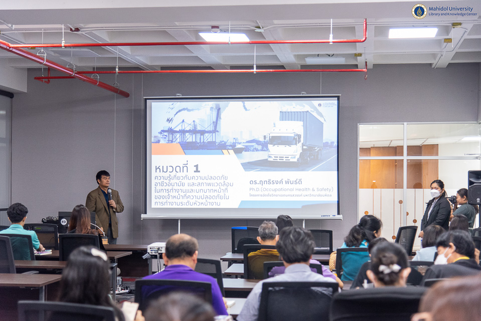 หอสมุดและคลังความรู้มหาวิทยาลัยมหิดล จัดโครงการอบรมหลักสูตร “เจ้าหน้าที่ความปลอดภัยในการทำงาน ระดับหัวหน้างาน” โดยคณะกรรมการความปลอดภัย อาชีวอนามัย และสภาพแวดล้อมในการทำงาน หอสมุดและคลังความรู้มหาวิทยาลัยมหิดล ได้รับเกียรติจาก ผู้ช่วยศาสตราจารย์ ดร.สราวุธ เวชกิจ ผู้อำนวยการหอสมุดและคลังความรู้ฯ กล่าวขอบคุณวิทยากร และอาจารย์ ดร.เอกชัย วารินศิริรักษ์ รองผู้อำนวยการฝ่ายนวัตกรรมบริการห้องสมุด เป็นประธานกล่าวเปิดการอบรมฯ โดยมี อาจารย์ ดร.ฤทธิรงค์ พันธ์ดี โครงการจัดตั้งวิทยาเขตนครสวรรค์ มหาวิทยาลัยมหิดล และผู้ช่วยศาสตราจารย์ ดร.วรกมล บุณยโยธิน คณะสาธารณสุขศาสตร์ มหาวิทยาลัยมหิดล เป็นวิทยากรบรรยายให้ความรู้ ระหว่างวันที่ 16-17 ธันวาคม พ.ศ. 2567 ณ ห้องประชุม 2 ชั้น 3 อาคารหอสมุดและคลังความรู้ฯ ศาลายา การจัดอบรมในครั้งนี้มีวัตถุประสงค์เพื่อให้บุคลากรหอสมุดและคลังความรู้ฯ ทราบและตระหนักถึงบทบาทและหน้าที่ของหัวหน้างาน ในฐานะเจ้าหน้าที่ความปลอดภัยในการทำงาน ซึ่งมีความสำคัญต่อการนำนโยบายด้านความปลอดภัยในการทำงานกระจายไปสู่การปฏิบัติภายในหอสมุดและคลังความรู้ฯ รวมถึงการป้องกันและควบคุมอันตรายจากการทำงาน