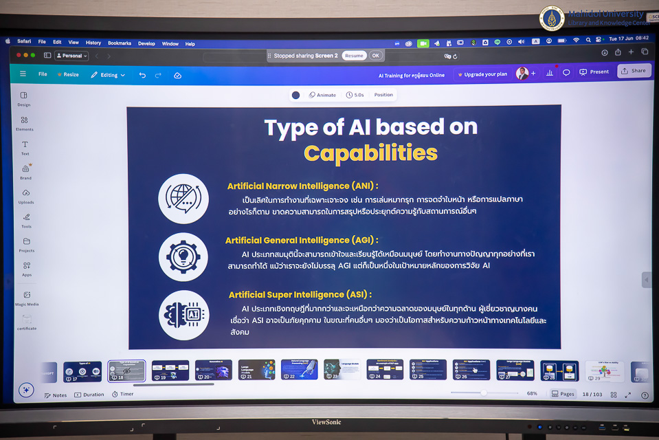 หอสมุดและคลังความรู้มหาวิทยาลัยมหิดล โดยงานการจัดการความรู้ ฝ่ายคลังความรู้ ร่วมกับหน่วยทรัพยากรบุคคล ดำเนินการจัดการอบรมเชิงปฏิบัติการ Generative AI เพื่อการเรียนการสอนสำหรับโรงเรียนระดับประถมศึกษาและมัธยมศึกษา โดยมี ผู้ช่วยศาสตราจารย์ ดร.ทวีศักดิ์ สมานชื่น รองผู้อำนวยการฝ่ายเทคโนโลยีดิจิทัล เป็นประธานกล่าวเปิดงานและให้เกียรติเป็นวิทยากรบรรยายให้ความรู้ในครั้งนี้ ในวันอังคารที่ 17 มิถุนายน พ.ศ. 2568 ในรูปแบบออนไลน์ผ่านระบบ Cisco Webex Meeting โดยมีคณาจารย์ นักเรียน และผู้ที่สนใจจากทั่วประเทศเข้ารับการอบรมทั้งสิ้น 33 ท่าน เพื่อศึกษาแนวทางการประยุกต์ใช้เทคโนโลยีปัญญาประดิษฐ์ (AI) สำหรับการสร้างแผนการเรียนการสอนอย่างมีประสิทธิภาพ สอดคล้องกับการเรียนรู้ในศตวรรษที่ 21