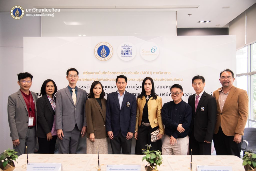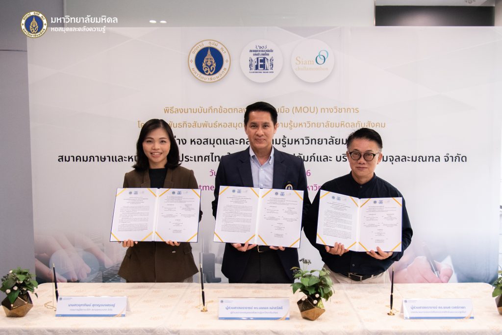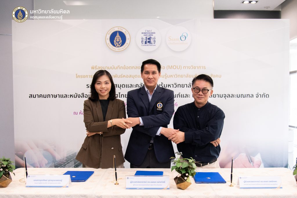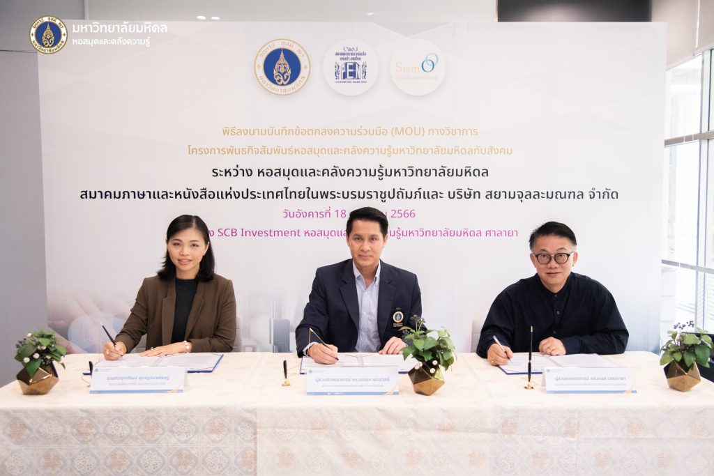 ผู้ช่วยศาสตราจารย์ ดร.นพพล เผ่าสวัสดิ์ ผู้อำนวยการหอสมุดและคลังความรู้มหาวิทยาลัยมหิดล พร้อมด้วย ผู้ช่วยศาสตราจารย์ ดร.ธเนศ เวศร์ภาดา นายกสมาคมภาษาและหนังสือแห่งประเทศไทย ในพระบรมราชูปถัมภ์ และคุณจุฑาทิพย์ สุกาญจนาเศรษฐ์ กรรมการผู้จัดการบริษัท สยามจุลละมณฑล จำกัด ร่วมกันลงนามบันทึกข้อตกลงความร่วมมือ (MOU) ทางวิชาการโครงการพันธกิจสัมพันธ์หอสมุดและคลังความรู้มหาวิทยาลัยมหิดลกับสังคม ระหว่างหอสมุดและคลังความรู้มหาวิทยาลัยมหิดล และสมาคมภาษาและหนังสือแห่งประเทศไทย ในพระบรมราชูปถัมภ์ ร่วมกับบริษัท สยามจุลละมณฑล จำกัด ในวันอังคารที่ 18 เมษายน 2566 ที่ผ่านมา ในโอกาสนี้ ดร.อภิภู สิทธิภูมิมงคล รองผู้อำนวยการฝ่ายเทคโนโลยีการศึกษาและพันธกิจพิเศษ กล่าวรายงานความเป็นมาและวัตถุประสงค์ฯ ในครั้งนี้ ณ ห้อง SCB Investment Lab ชั้น 1 อาคารหอสมุดและคลังความรู้มหาวิทยาลัยมหิดล ศาลายา