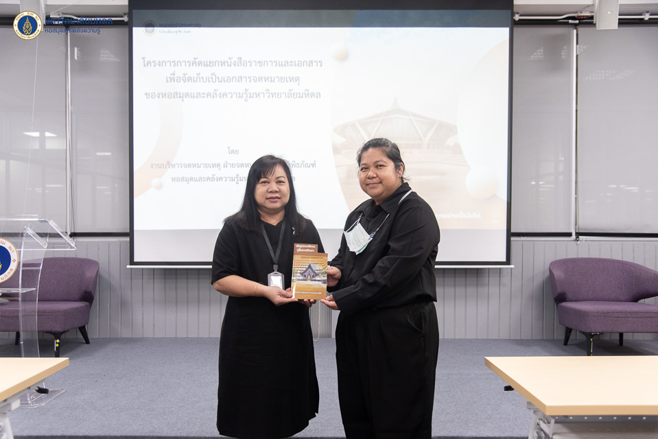 หอสมุดและคลังความรู้มหาวิทยาลัยมหิดล โดย คุณอังคณา อินทรพาณิชย์ รองผู้อำนวยการฝ่ายบริหารและพัฒนาคุณภาพ เป็นประธานกล่าวเปิดการอบรมโครงการคัดแยกหนังสือราชการและเอกสาร เพื่อจัดเก็บเป็นเอกสารจดหมายเหตุของหอสมุดและคลังความรู้มหาวิทยาลัยมหิดล จัดโดยงานบริหารจดหมายเหตุ โดยมีคุณปัญจวัลย์ ชาวดง นักจดหมายเหตุ เป็นวิทยากรบรรยายให้ความรู้ ในวันพฤหัสบดีที่ 18 ธันวาคม พ.ศ. 2568 ณ ห้องประชุม 1 ชั้น 3 อาคารหอสมุดและคลังความรู้ฯ ศาลายา โดยมีวัตถุประสงค์เพื่อส่งเสริมให้บุคลากรหอสมุดและคลังความรู้ฯ สามารถคัดแยกหนังสือราชการและเอกสารที่เกี่ยวข้อง การจัดการเอกสารสำคัญได้อย่างเป็นระบบ และมีระเบียบ อีกทั้งยังสามารถรวบรวมหนังสือสำคัญของส่วนงานที่สะท้อนประวัติและพัฒนาการของส่วนงานซึ่งจะกลายเป็นเอกสารจดหมายเหตุของส่วนงานในอนาคตให้อยู่อย่างครบถ้วนสมบูรณ์