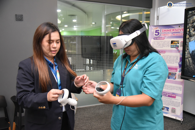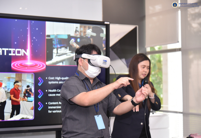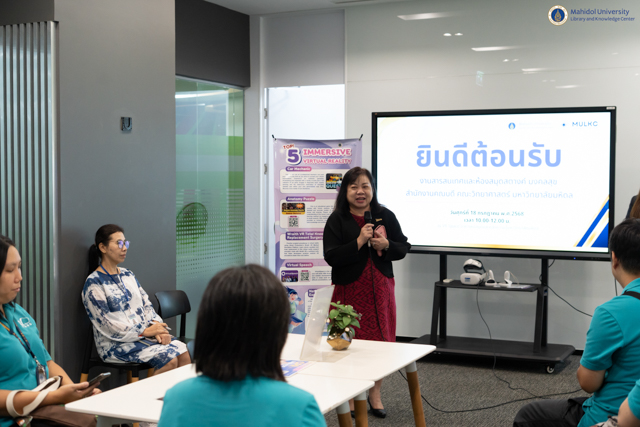หอสมุดและคลังความรู้มหาวิทยาลัยมหิดล โดย คุณอังคณา อินทรพาณิชย์ รองผู้อำนวยการฝ่ายบริหารและพัฒนาคุณภาพ และคุณอุษณีย์ เพ็งเที่ยง รองผู้อำนวยการฝ่ายทรัพยากรและคลังความรู้ ให้การต้อนรับคณะผู้ศึกษาดูงานจากงานสารสนเทศและห้องสมุดสตางค์ มงคลสุข สำนักงานคณบดี คณะวิทยาศาสตร์ มหาวิทยาลัยมหิดล นำโดย อาจารย์ ดร.ธน เตชะเลิศไพศาล ผู้ช่วยคณบดีฝ่ายสารสนเทศ พร้อมด้วยบุคลากรคณะวิทยาศาสตร์ มหาวิทยาลัยมหิดล จำนวนทั้งสิ้น 9 ท่าน ในโอกาสเข้าศึกษาดูงาน VR for Education ในวันศุกร์ที่ 18 กรกฎาคม พ.ศ. 2568 ณ ห้อง VR Space ชั้น 1 อาคารหอสมุดและคลังความรู้ฯ ศาลายา โดยมีวัตถุประสงค์เพื่อศึกษาและแลกเปลี่ยนเรียนรู้รูปแบบการบริการเทคโนโลยีแว่น VR เพื่อนำไปปรับใช้และพัฒนาบริการให้สอดคล้องกับคณะวิทยาศาสตร์ มหาวิทยาลัยมหิดลต่อไป