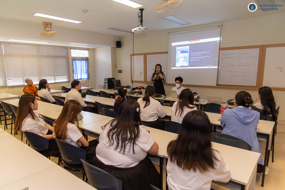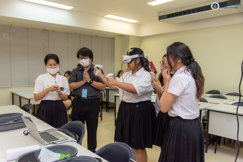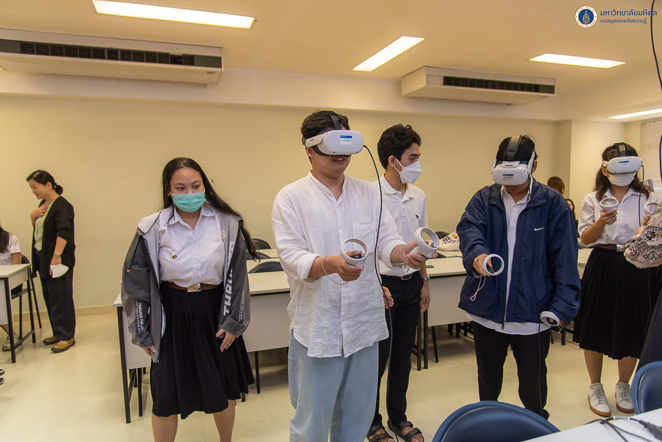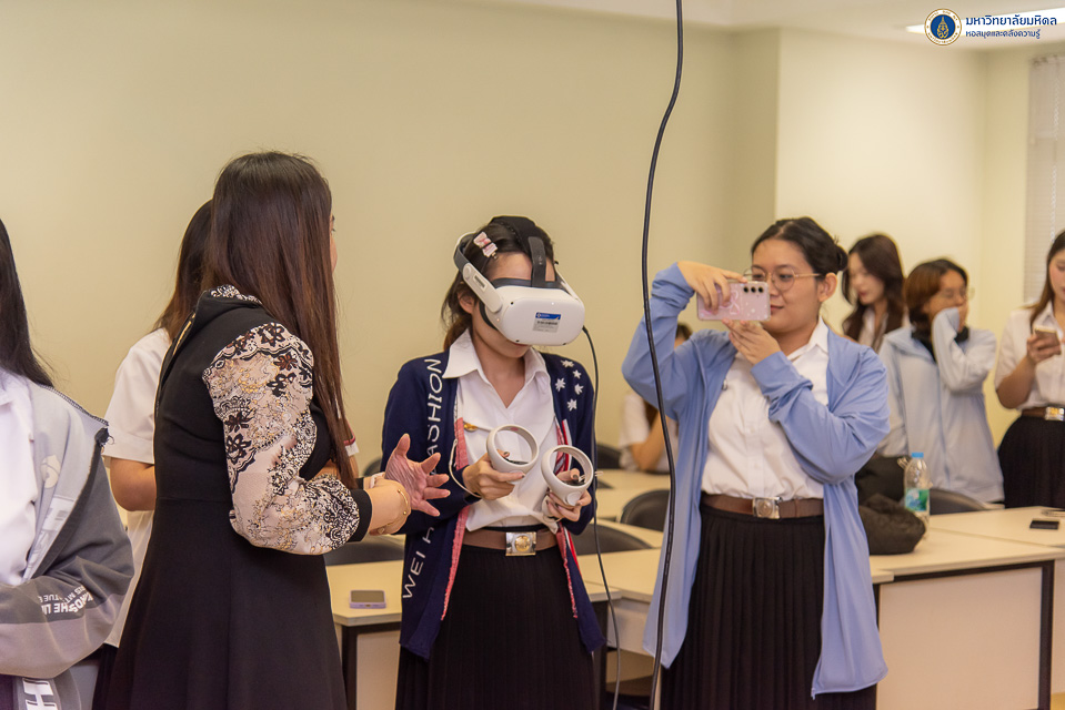 หอสมุดและคลังความรู้มหาวิทยาลัยมหิดล โดย คุณนภัสวรรณ สุพัตร หัวหน้างานเทคโนโลยีการศึกษา ได้รับเกียรติเป็นวิทยากรบรรยาย เรื่อง VR (Virtual Reality) ให้กับนักศึกษา วิทยาลัยศาสนศึกษา มหาวิทยาลัยมหิดล จำนวน 64 คน ในวันจันทร์ที่ 18 พฤศจิกายน พ.ศ. 2567 ณ วิทยาลัยศาสนศึกษา โดยการจัดกิจกรรมในครั้งนี้ เป็นการบูรณาการร่วมกันระหว่างหอสมุดและคลังความรู้ฯ และวิทยาลัยศาสนศึกษา ภายใต้รายวิชา ศศศศ 446 ศาสนาในยุคดิจิทัล ในการส่งเสริมให้นักศึกษาได้สร้างประสบการณ์การเรียนรู้รูปแบบใหม่ และประยุกต์ใช้เทคโนโลยีโลกเสมือนจริงกับการเรียนรู้ได้อย่างมีประสิทธิภาพมากยิ่งขึ้น