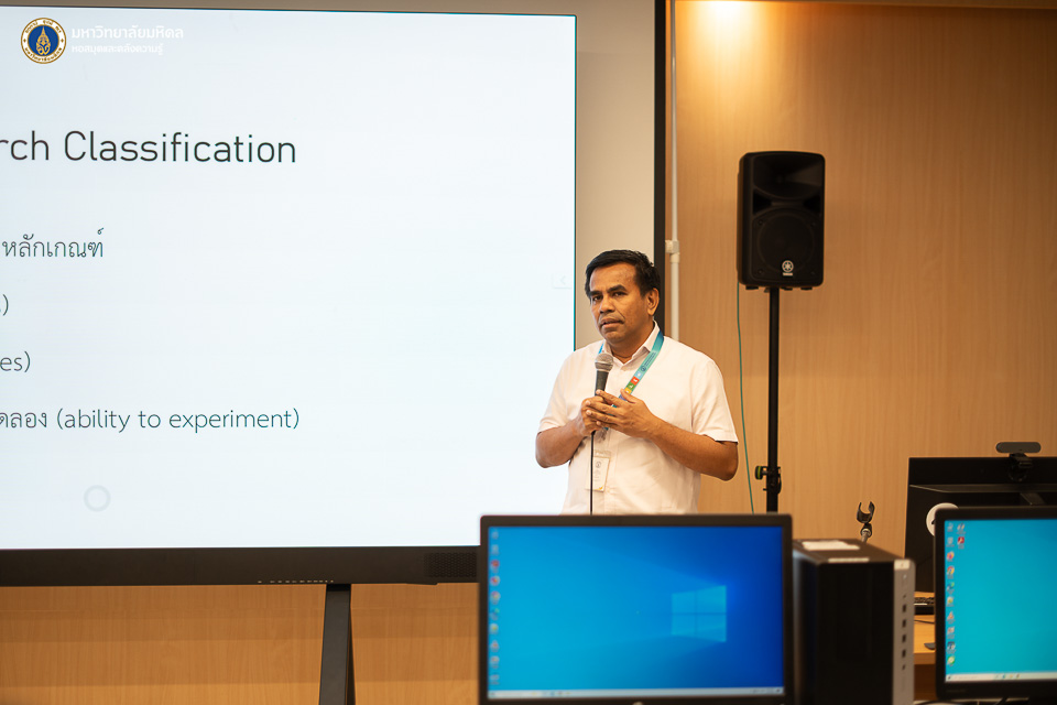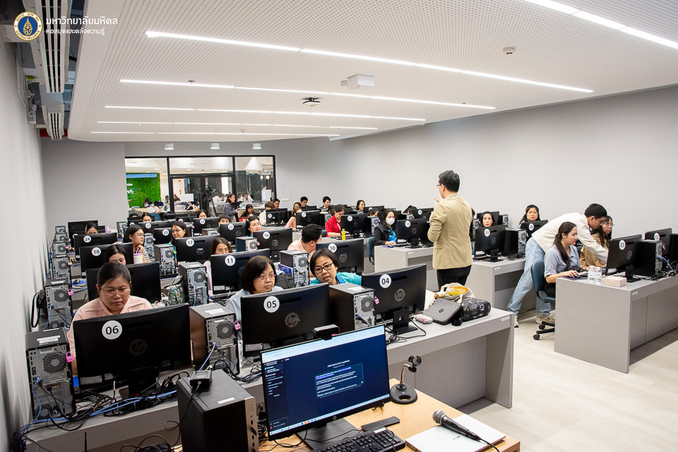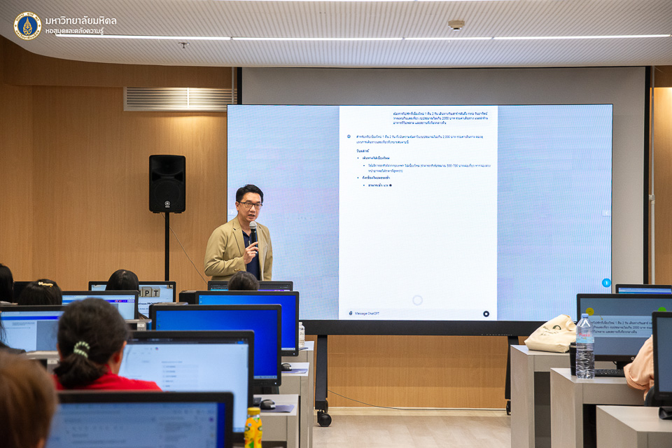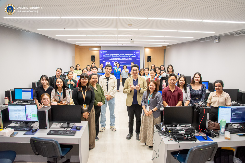 หอสมุดและคลังความรู้มหาวิทยาลัยมหิดล จัดอบรม AI Powered Topic Generation & Research Question Formulation ภายใต้โครงการ AI Skill raise-up for Research assistant: ยกระดับทักษะปัญญาประดิษฐ์สำหรับผู้ช่วยการวิจัย โดยมี ผู้ช่วยศาสตราจารย์ ดร.ทวีศักดิ์ สมานชื่น รองผู้อำนวยการฝ่ายเทคโนโลยีดิจิทัล เป็นวิทยากรบรรยายในหัวข้อ “Research Process Overview” และคุณปัญจพัฒน์ เกรียงวีระยุทธ Gen AI Trainer บริษัท Go Digit จำกัด เป็นวิทยากรบรรยายในหัวข้อ “การใช้ AI ในการสร้างหัวข้อวิจัย” ในวันอังคารที่ 19 สิงหาคม พ.ศ. 2568 ณ ห้องอบรมคอมพิวเตอร์ ชั้น 2 อาคารหอสมุดและคลังความรู้ฯ โดยมีผู้เข้ารับการอบรมทั้งสิ้น จำนวน 37 คน เพื่อเรียนรู้การใช้ AI คิดหัวข้องานวิจัย การค้นหาช่องว่างทางการวิจัยด้วยโปรแกรม Gemini และ Copilot และการสร้างหัวข้อคำถามวิจัยด้วยการเขียนคำสั่ง Prompt